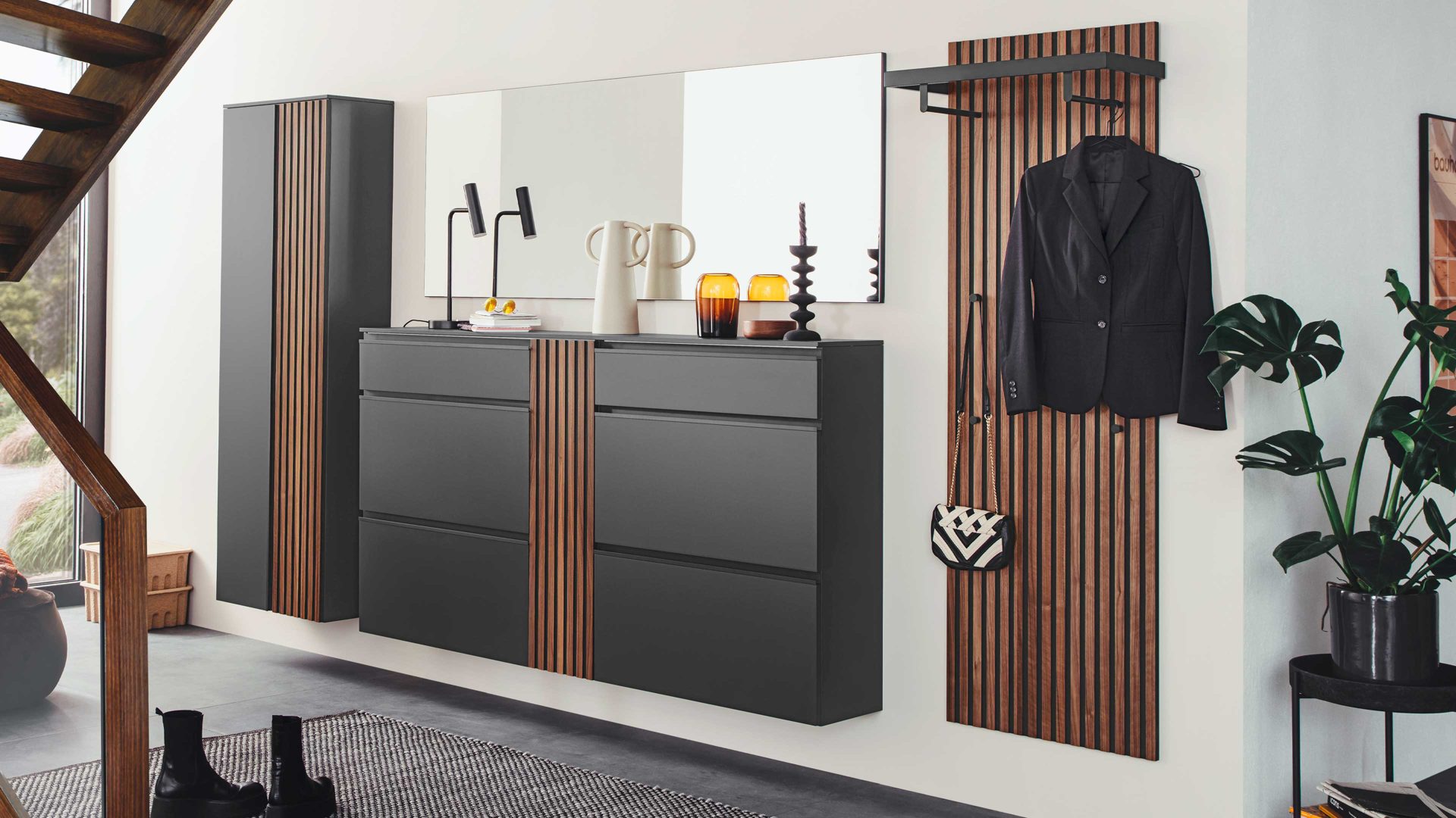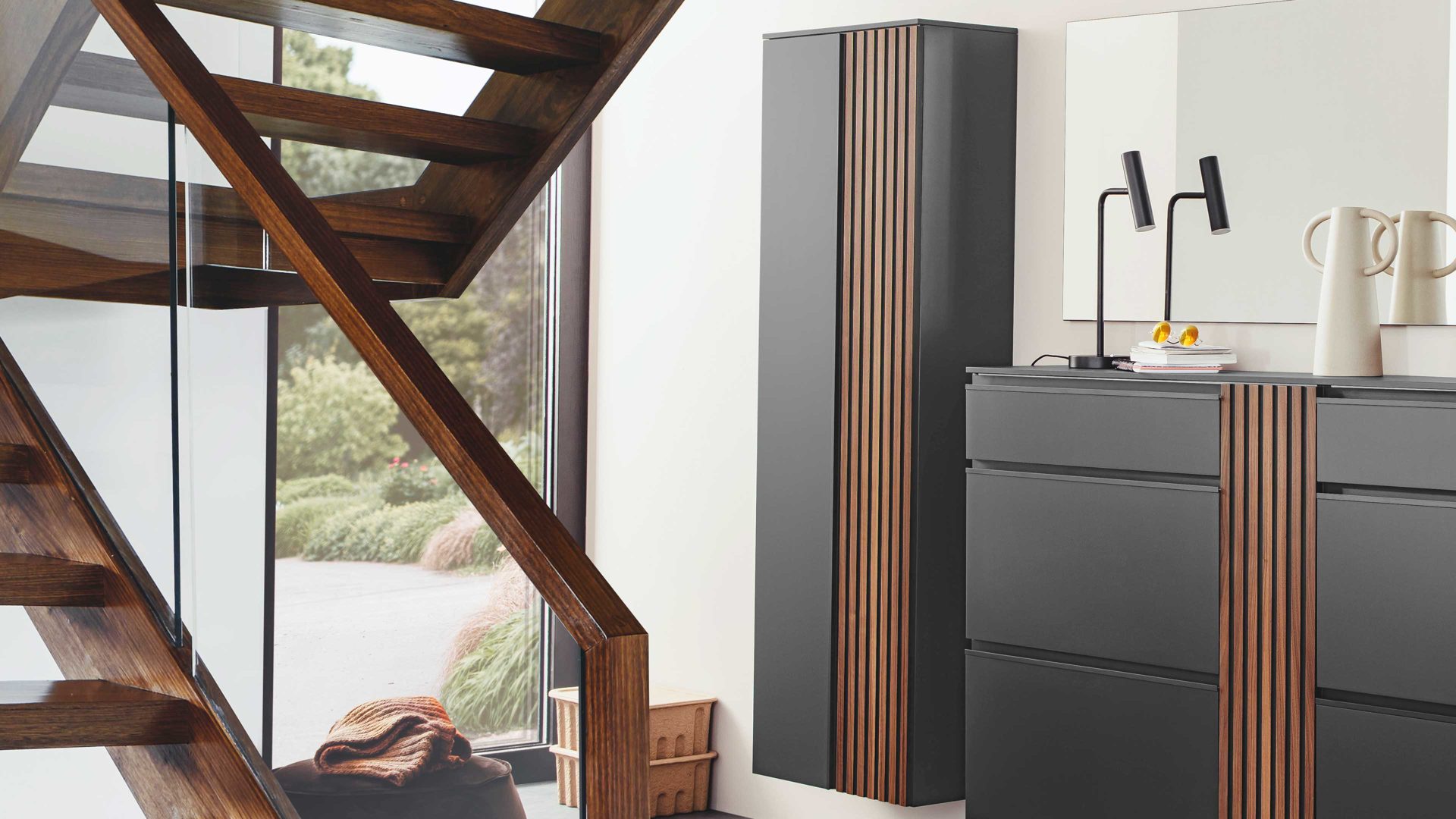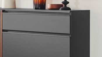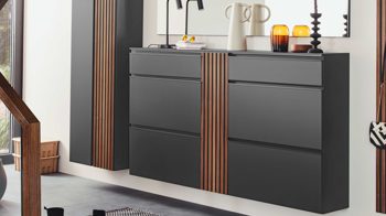 anthrazitfarbener Mattlack, kombiniert mit Kernnussbaumfurnier