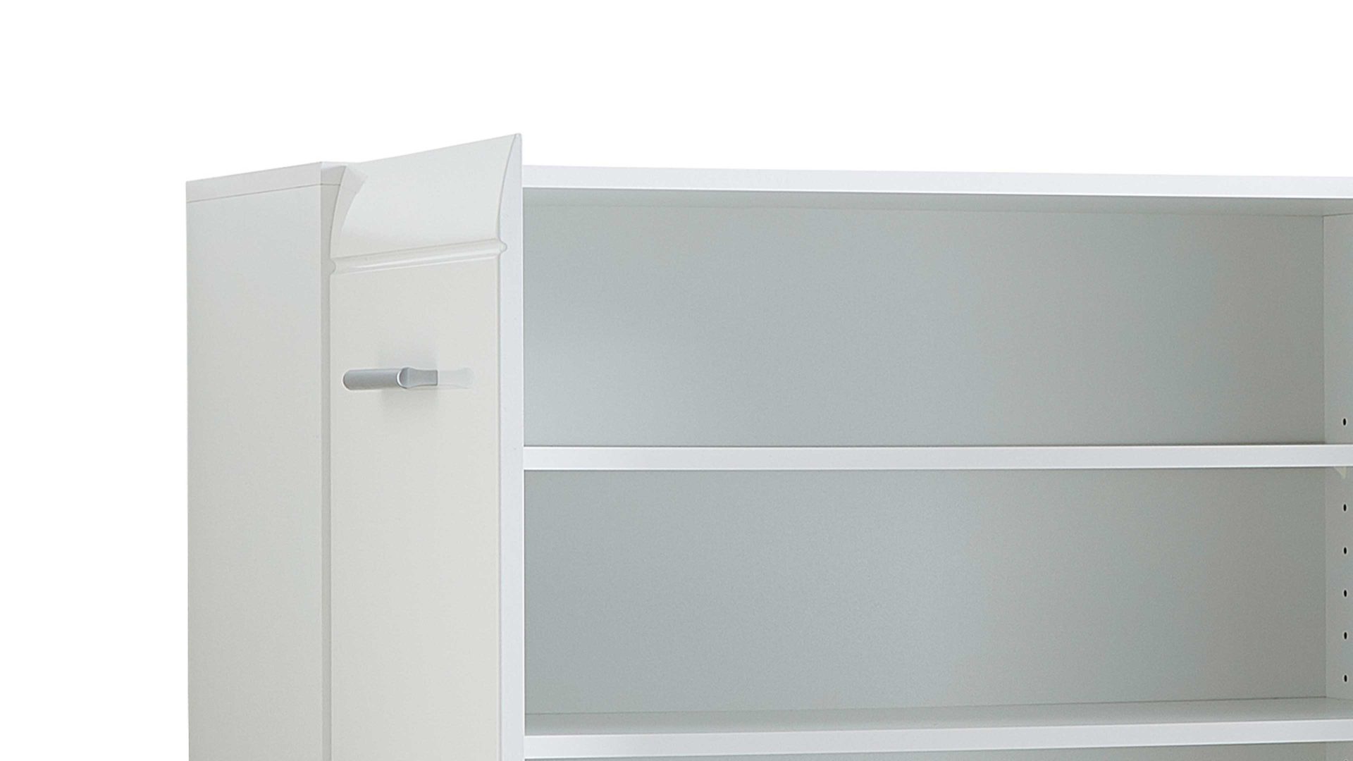 Verstauen Sie Ihre Schuhe staubfrei und ordentlich in diesem praktischen Schuhschrank in strahlendem Weiß. In Ihrer Diele sorgt diese Art der Schuhaufbewahrung jederzeit für Ordnung, denn Sie bietet ausreichend Platz für etwa 20 Paar Schuhe, die Sie dadurch stets griffbereit haben. Bringen Sie Ihre Sandalen, Sneaker oder Halbschuhe in diesem formschönen und zeitlosen Schuhschrank unter, der über eine Doppeltür und fünf Einlegebögen verfügt und damit wunderbar unkompliziert in der Handhabung ist.
