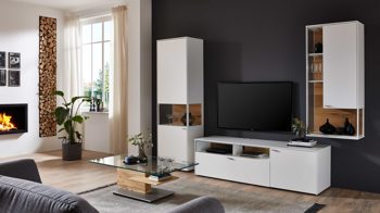 Die eintürige Vitrine 5290-3711L misst ca. 62 x 207 x 43 cm (BxHxT). Auf ca. 182 x 55 x 53 cm (BxHxT) belaufen sich die Maße des Lowboards 5234-3711R mit einer Tür und einer Schublade. Ca. 62 x 139 x 33 cm (BxHxT) ist die eintürige Hängevitrine 5247-3711R groß. Das Gesamtmaß der Wohnwand beläuft sich auf ca. 303 x 207 x 53 cm (BxHxT). Sie bietet Ihnen viel praktischen und stilvollen Stauraum für Gegenstände, die Sie licht- und staubgeschützt aufbewahren oder gelungen in Szene setzen wollen. Alle drei Wohnmöbel werden Ihnen bereits fertig montiert geliefert. Als optionales Zubehör fungieren stimmungsvolle LED-Beleuchtungen sowie beim Lowboard auch ein Kabeldurchlass und ein Untergestell.