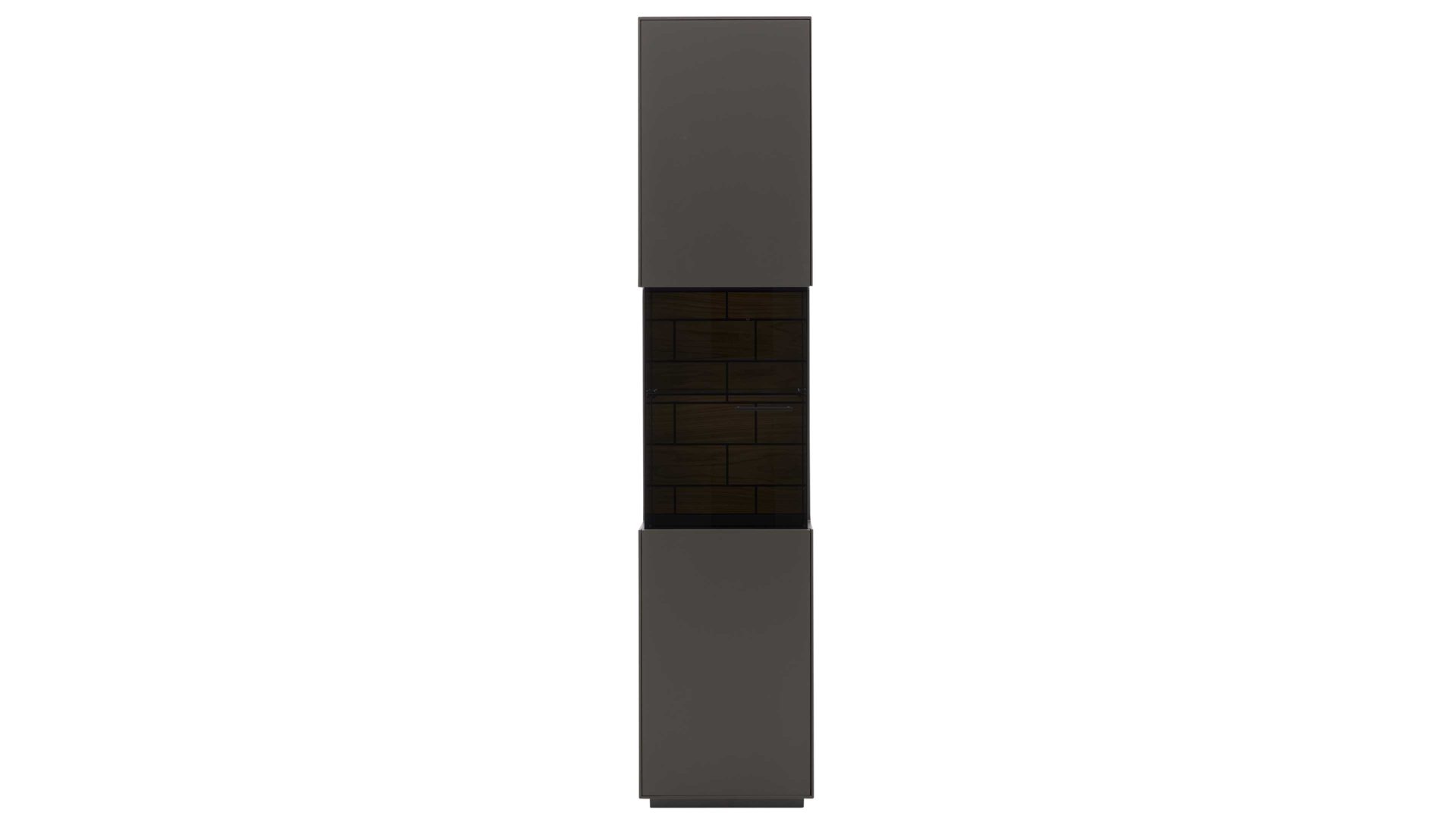 Die Vitrine aus der Interliving Wohnzimmer Serie 2030 vereint modernes Design mit praktischer Aufteilung – perfekt als stilvoller Glasschrank, Einzelvitrine oder eleganter Solitär im Wohn- oder Esszimmer. Die wolframgrauen Lackoberflächen verleihen dem Möbelstück eine ruhige, edle Ausstrahlung. Für spannende Akzente sorgen graues Parsolglas, eine sichtbare Rückwand mit Spaltholz auf schwarzer MDF, ein Holzsockel sowie ein Griff aus schwarz lackiertem Metall mit feiner Struktur. So entsteht ein harmonisches Gesamtbild mit einem Hauch von Exklusivität.