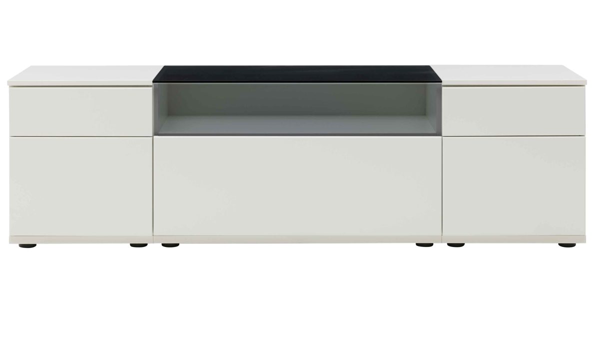 Das Lowboard aus der Interliving Wohnzimmer Serie 2031 ist die ideale Basis für dein Home-Entertainment. In mattem Tonweiß und mit grau getöntem Floatglas bringt es moderne Leichtigkeit und dezente Eleganz in dein Wohnzimmer. Die grifflosen Fronten mit Push-to-open-Funktion sorgen für ein klares, ruhiges Erscheinungsbild, das perfekt zu einem minimalistischen Wohnstil passt. Mit Maßen von ca. 180 x 54 x 45 cm (B/LxHxT) bietet das Lowboard ausreichend Platz für TV, Technik und Zubehör – und wird dabei zum echten Designhighlight.
