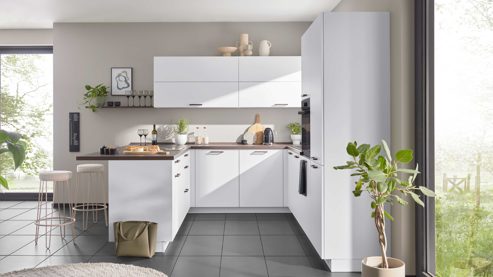 Die Culineo® Einbauküche C615 verbindet modernes Küchendesign mit cleverer Funktionalität – perfekt, wenn du eine stilvolle Küche suchst, die im Alltag überzeugt. Matte alpinweiße Fronten und Korpusse treffen auf walnussfarbene Metall-Bügelgriffe; Arbeitsplatten, Ansetztheke und Regalboden in Walnuss Natur Nachbildung sorgen für warme Akzente. Als U-Küche mit einer Stellfläche von ca. 280 x 305 cm (B/LxT, von links nach rechts) bietet sie dir viel Bewegungsfreiheit, Arbeitsfläche und Stauraum – ideal für Einbauküche, Planküche, Systemküche und moderne Küchenmöbel.