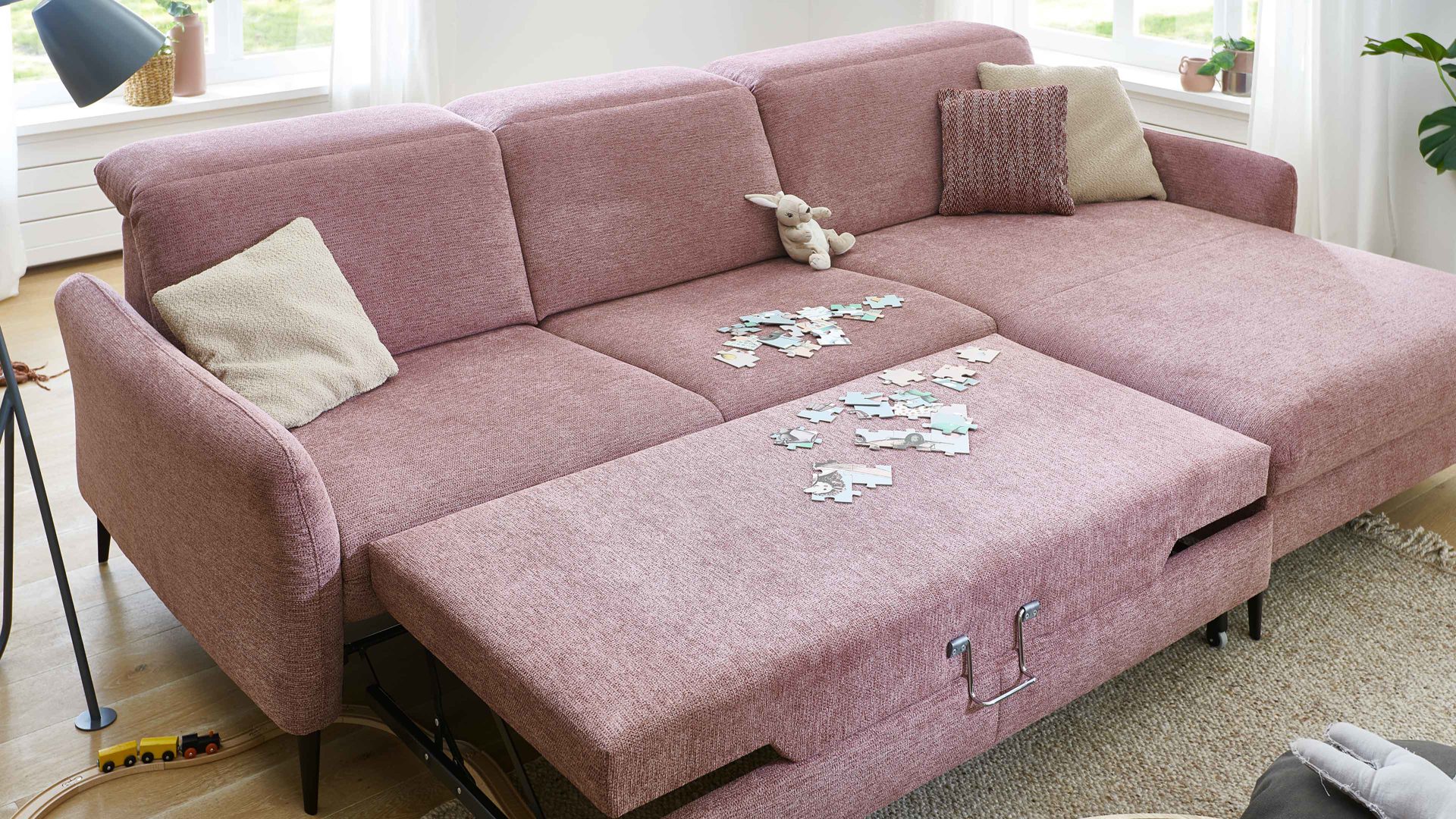 • Die Abbildung zeigt ein Wohnbeispiel, welches auch Dekoration sowie separat erhältliches Zubehör enthält. Im Lieferumfang enthalten ist eine Bettfunktion mit drellbezogener Liegefläche.