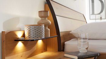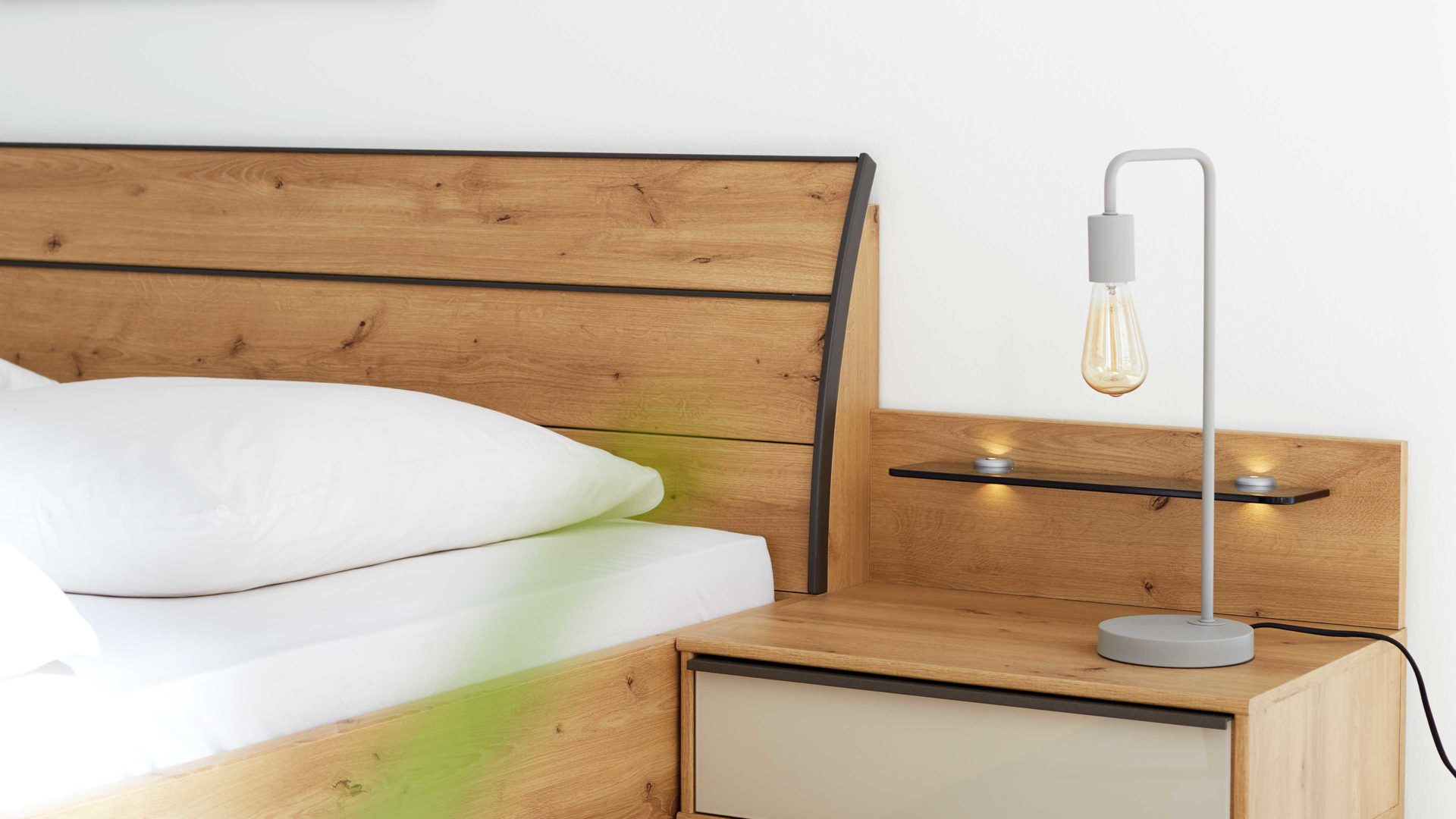 Warme Ästhetik: Das Zusammenspiel aus Glas, Holzoptik und feinen Details bringt eine moderne, aber gleichzeitig gemütliche Note in dein Schlafzimmer.