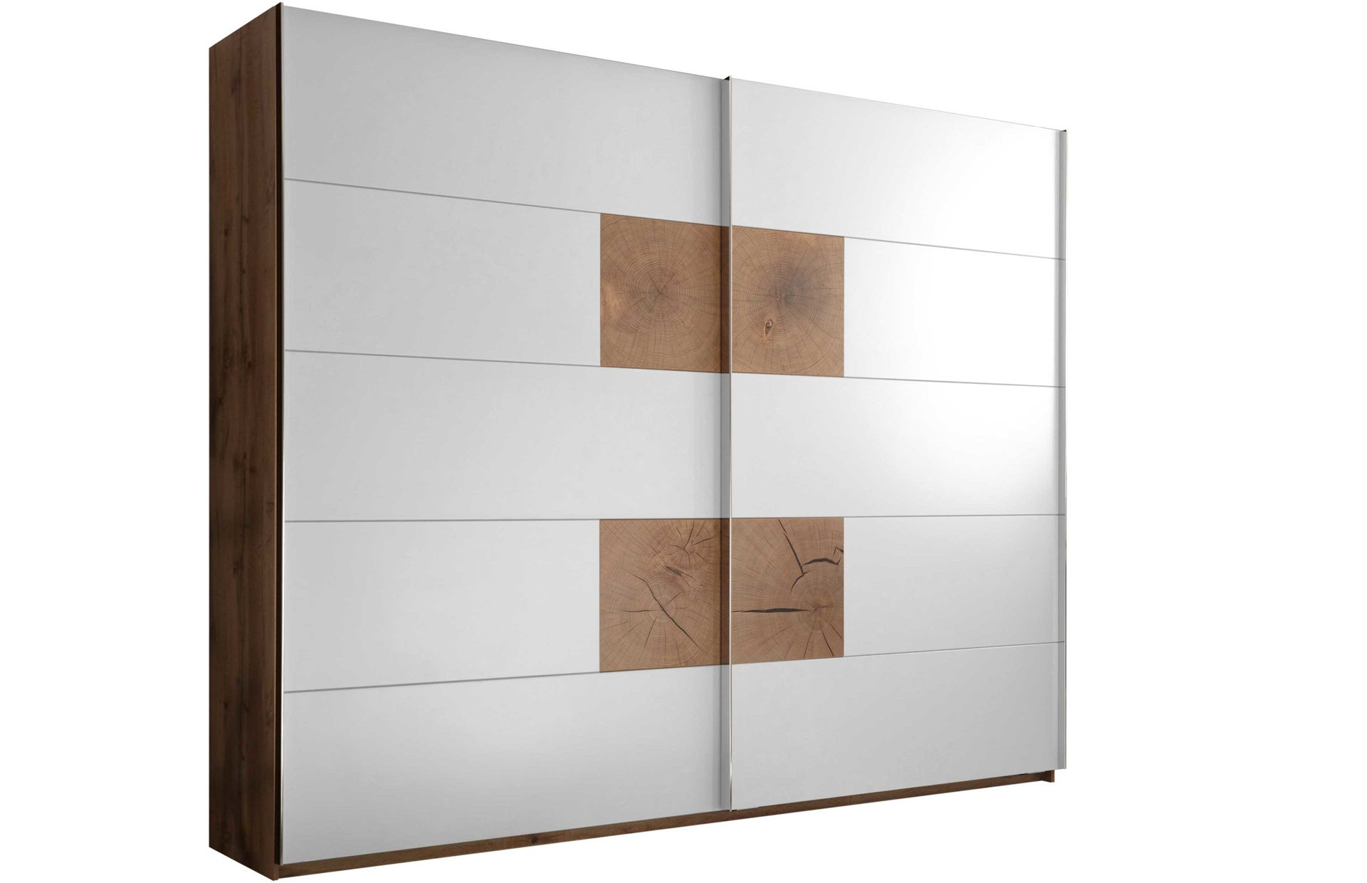 Der Kleiderschrank bietet Ihnen reichlich Stauraum für Kleidung und sonstige Textilien. Hinter den zwei Türen finden Sie insgesamt zwei Kleiderböden und zwei Kleiderstangen, sodass Sie Ihre Kleidungsstücke nach Bedarf liegend oder hängend aufbewahren können. Die Maße des überzeugenden Schlafzimmerschranks betragen ca. 270 x 225 x 60 cm (BxHxT). Gegen Mehrpreis steht er mit ansprechendem Passepartoutrahmen und schicker Beleuchtung zur Verfügung. Dank der Schwebetüren lässt sich der Schrank sehr raumsparend im Schlafzimmer platzieren.