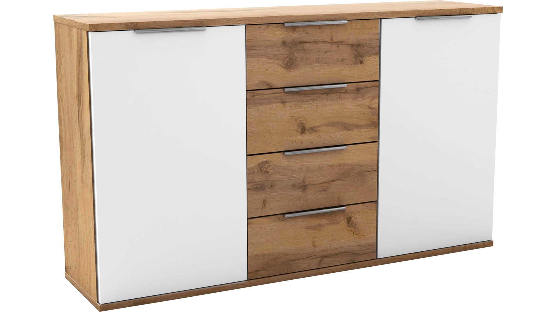 Der Kommodenschrank bietet Ihnen reichlich Stauraum für Unterwäsche, Bettwäsche, Accessoires und andere kleinere Gegenstände. Hinter den zwei Türen finden Sie jeweils einen Boden. Hinzu kommen vier Schubladen mit Soft-Close für besonders leises Schließen. Auf dem Oberboden des Schranks können Sie Dekoratives platzieren, beispielsweise eine Vase, eine Skulptur oder einen Bilderrahmen mit einem persönlichen Foto. Die Maße der überzeugenden Kommode betragen ca. 150 x 90 x 38 cm (BxHxT).