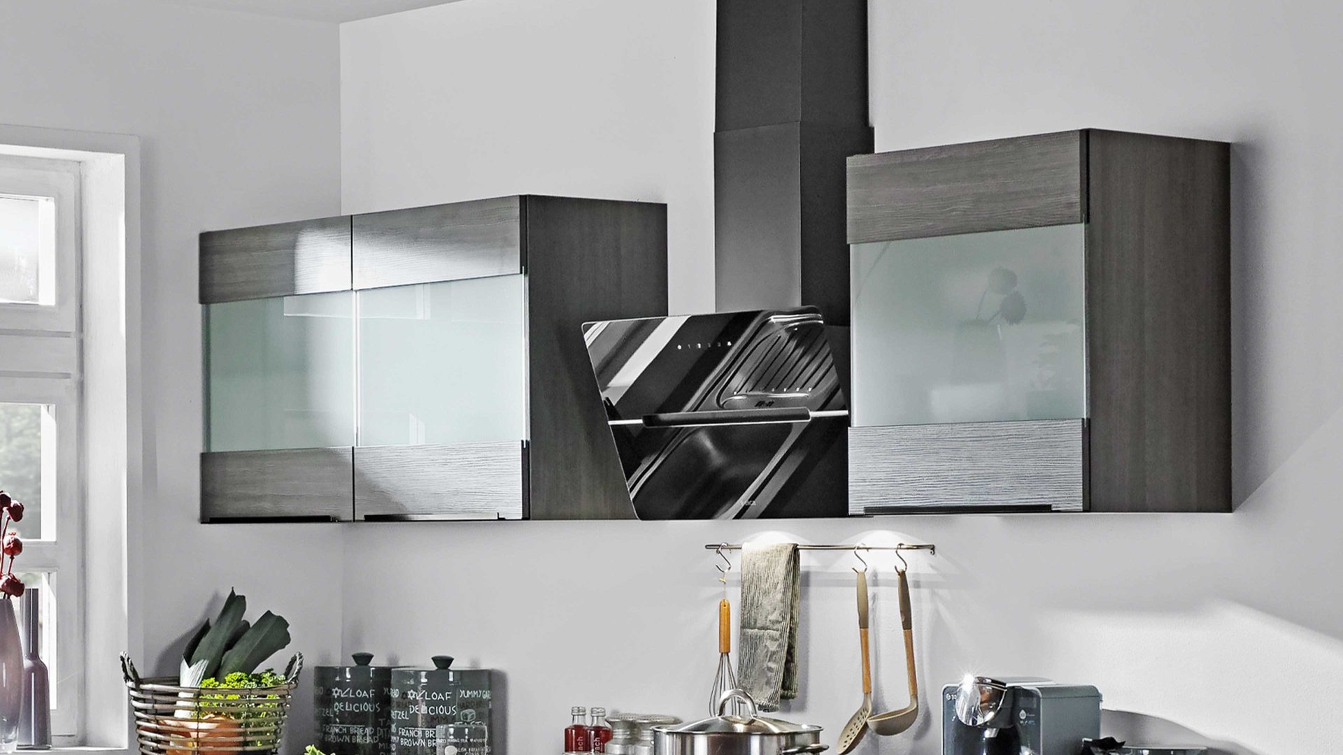 Hängeschränke mit Glaseinsätzen und ein offenes Regalelement in den Unterschränken