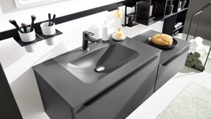 Das Highlight ist der mattgraue Duratek®-Waschtisch (Typ 87715) mit Hahnlochbohrung. Ohne Überlauf gefertigt, überzeugt er durch seine besonders widerstandsfähige, ultrakompakte Struktur. Die samtige Oberfläche fühlt sich angenehm an, ist kratz- und stoßfest und lässt sich mühelos reinigen. Maße: ca. 81 x 12 x 49 cm (B/LxHxT).