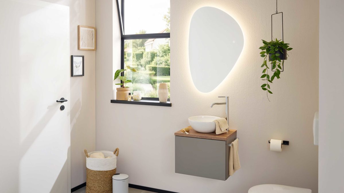 Ergänzt wird das Set durch einen organisch geformten Wandspiegel mit LED-Beleuchtung, der dein Gästebad optisch vergrößert und für angenehmes Licht sorgt.