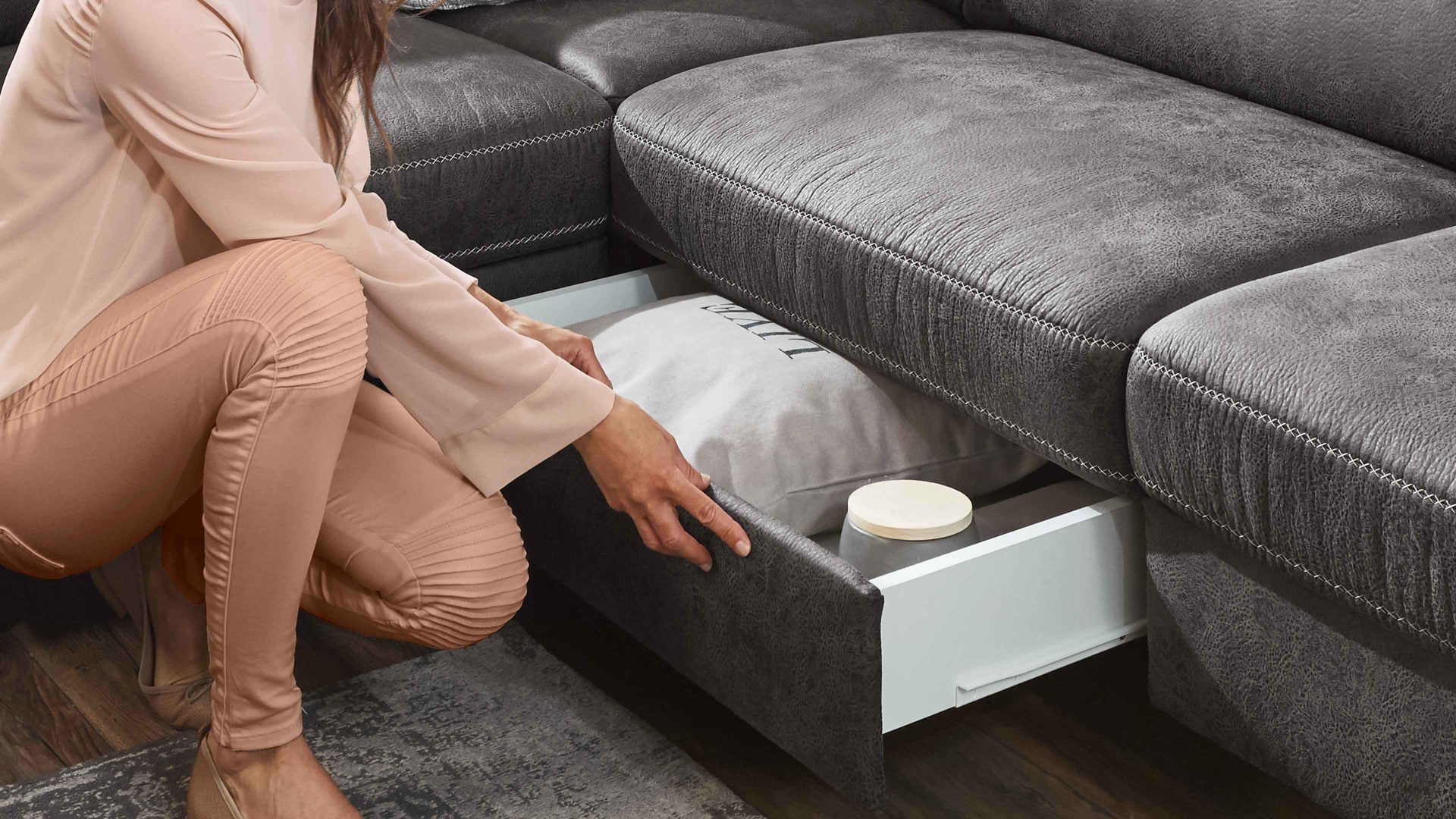 In der weiß beschichteten Schublade mit Stofffront verstauen Sie Kissen oder Gesellschaftsspiele. Ein weiteres Plus ist die Aufklappfunktion des Abschlusshockers - hier finden Decken oder andere große Dinge ihren festen Platz.