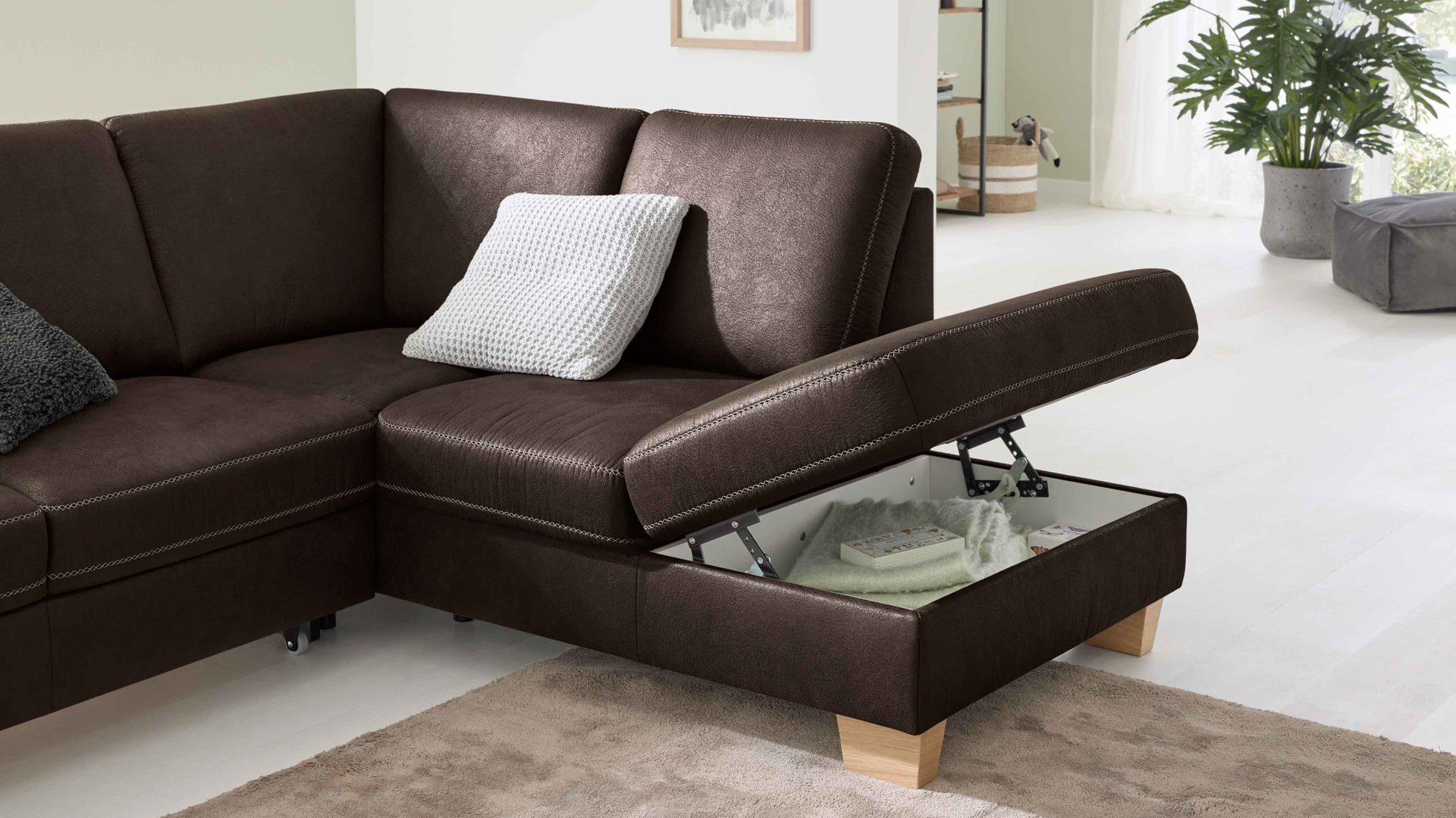 • Die Abbildung zeigt ein Wohnbeispiel, welches auch Dekoration sowie separat erhältliches Zubehör enthält. Im Lieferumfang enthalten ist die motorische Relaxfunktion.