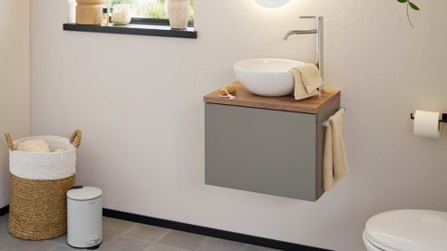 Die Gästebadlösung mit Spiegel aus der Interliving Bad Serie 3715 ist die perfekte Waschplatzlösung für kleine Bäder und Gäste-WCs. Das moderne Design mit taupegrau lackierten Lacklaminatfronten, taupegrauem Korpus und einem Abdeckboden in Viking Oak-Nachbildung wirkt ruhig, hochwertig und zeitlos – ideal, wenn du auch auf kleinem Raum Wert auf Stil, Funktion und Qualität legst.