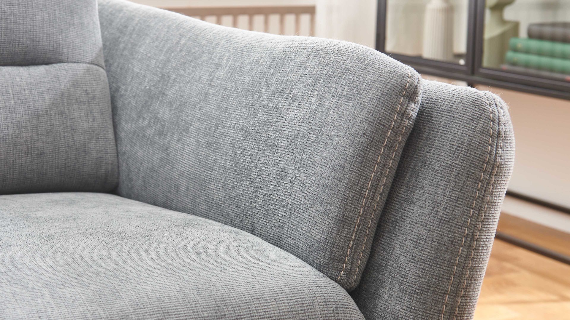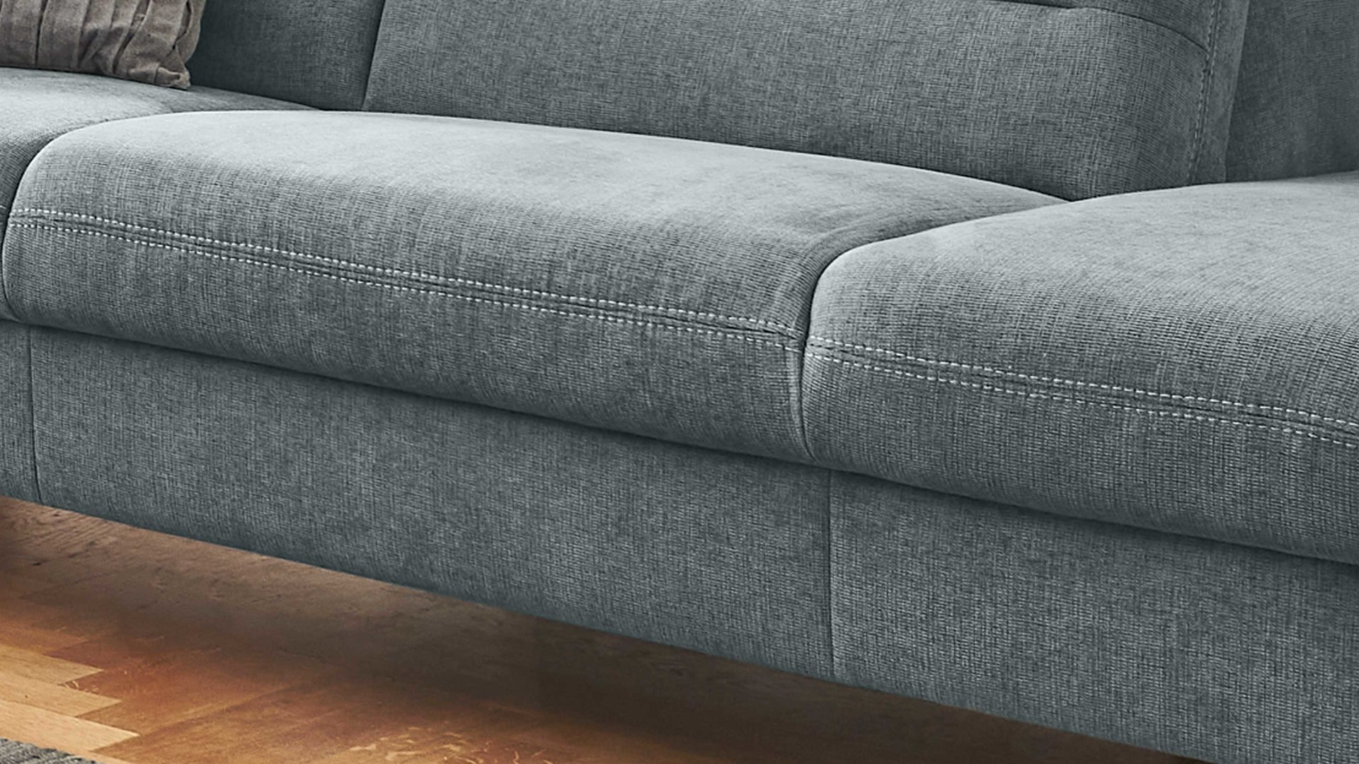 stahlfarbener Stoffbezug mit beiger Kontrast-Doppelsteppnaht