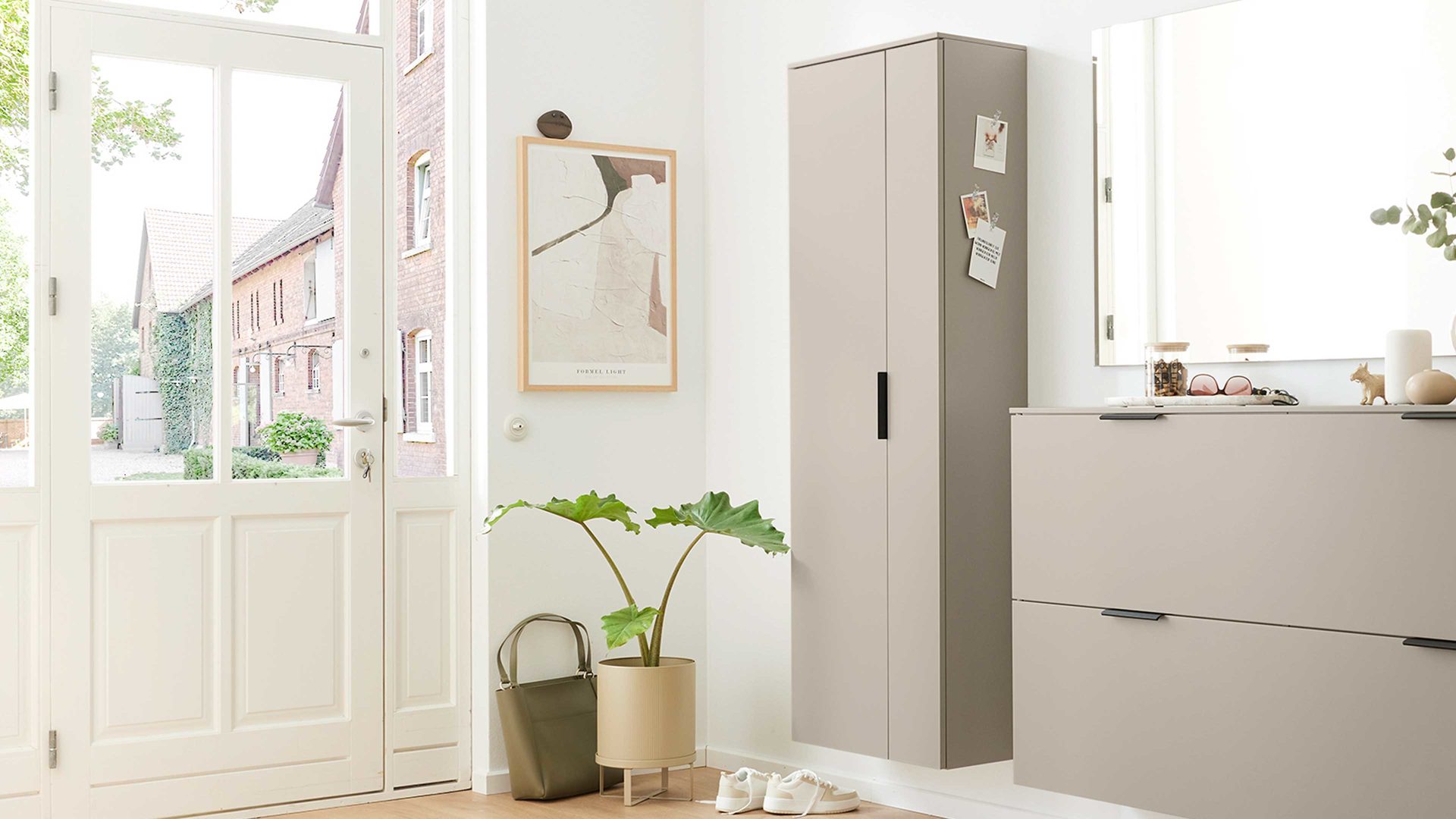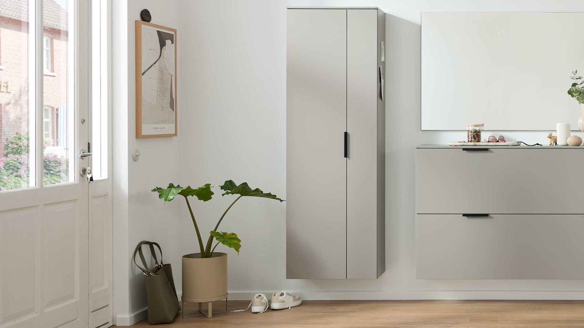 Das elegante Zusammenspiel aus graubeigem Mattlack und einem mattschwarzen Metallgriff verleiht dem Flurschrank eine dezente, hochwertige Optik, die sich harmonisch in verschiedenste Wohnstile einfügt.