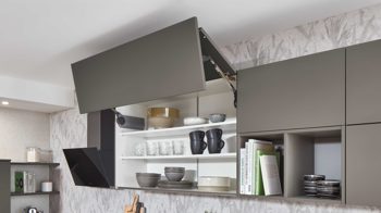 Die nobilia® Einbauküche Laser präsentiert sich in mattem Taupegrau und überzeugt mit einer ruhigen, eleganten Ausstrahlung. Gebürstete anthrazitfarbene Metallgriffe setzen dezente, moderne Akzente. Die Arbeitsplatten in weißer Terrazzo-Nachbildung bringen Frische ins Design und sorgen für einen spannenden, hochwertigen Kontrast.