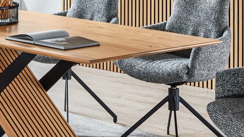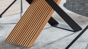Grafik-Untergestell mit Charakter-Eiche-Furnier in Lamellenoptik und einem Metallbügel