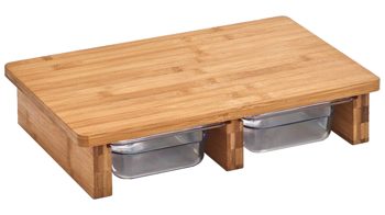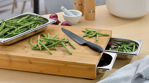 Ein Schneidebrett aus Bambus mit einem sehr nützlichen Feature: Eine integrierte, herausnehmbare Auffangschale (ca. 33 x 4 x 26,5 cm BxHxT) aus Edelstahl, welche auch als Auflaufform verwendet werden kann. So ist das Schnittgut ideal für die spätere Weiterverarbeitung vorbereitet. Alternativ können Sie die Schale z.B. auch zum Zwischenlagern von eventuellen Schnittabfällen verwenden. Maße ca. 36 x 7 x 27 cm (BxHxT)
