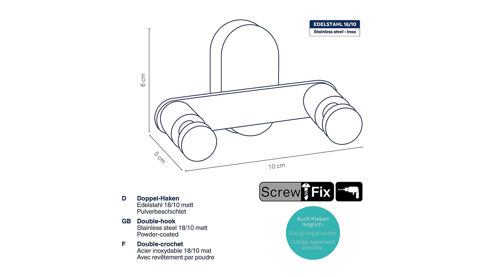 Organisieren Sie Ihr Badezimmer stilvoll und modern mit unserem hochwertigen Doppel-Wandhaken Alessio in eleganter, schwarzer Optik. Ideal zum Beispiel für kleinere oder größere Handtücher im Badezimmer. Zudem bietet er zuverlässigen Halt. Montage ganz nach Wunsch: Mit Schrauben (Montagematerial inklusive) oder auch ohne Bohren (Kleber müsste separat gekauft werden). Verleihen Sie Ihrem Badezimmer einen modernen Touch. Maße ca. 10 x 6 x 5 cm (BxHxT)