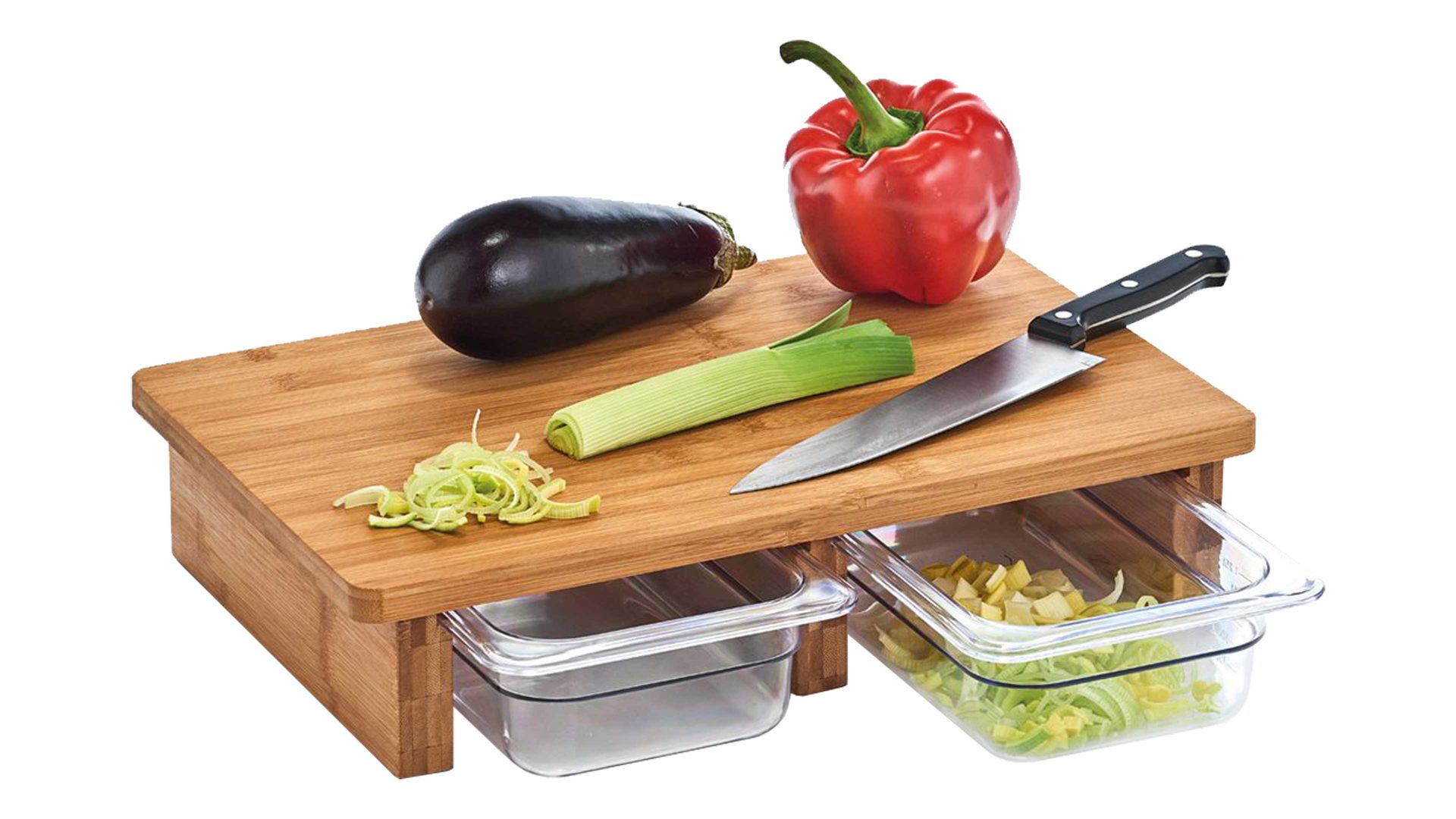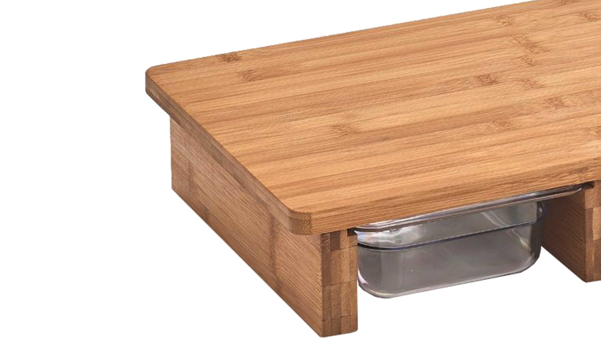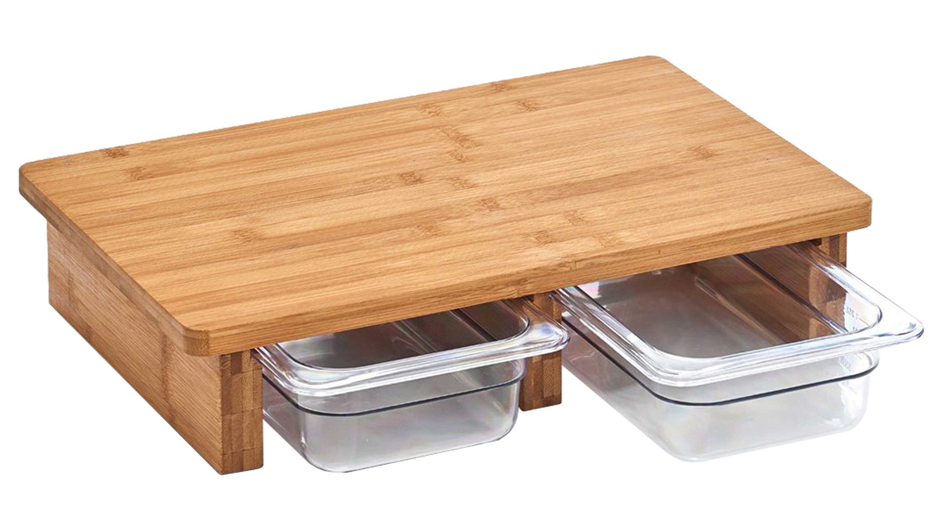 Ob für Schnittgut oder dessen Abfälle, mit unserem Schneidebrett aus Bambus und den zwei praktischen Auffangschalen aus robustem Kunststoff haben Sie stets Ordnung auf Ihrer Arbeitsfläche. Die Auffangschalen einfach über die Schienen herausziehen und die geschnittenen Lebensmittel von der Schneideoberfläche in die Schalen geben.