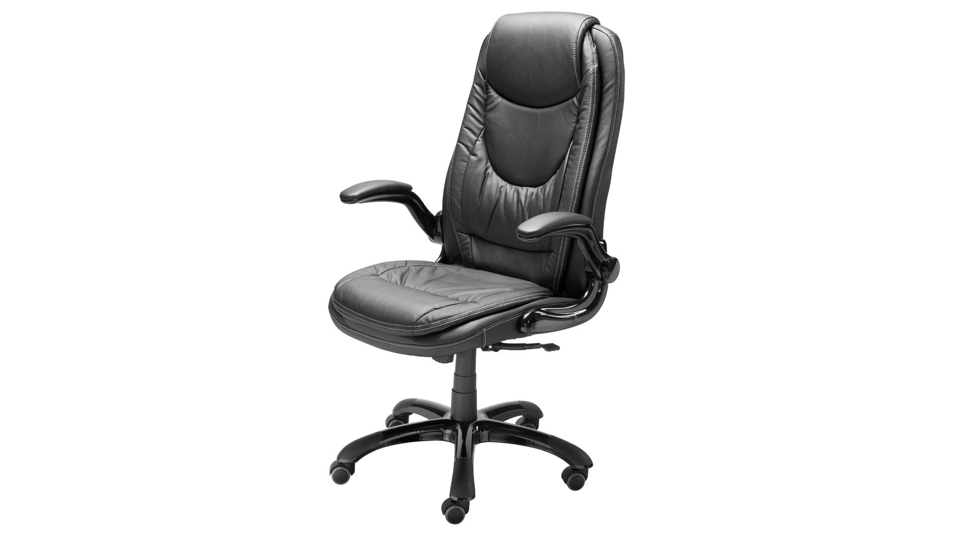 Sein hochwertiger Kunstlederbezug sowie das in Schwarz gehaltene Drehkreuz und die Armlehnen sorgen dafür, dass diese funktionale Sitzgelegenheit Ihren hohen Anforderungen standhält. Die hochglänzenden schwarzen Amlehnen lassen sich nicht nur hochklappen, sie sind auch für eine entspannte Armhaltung bequem gepolstert.