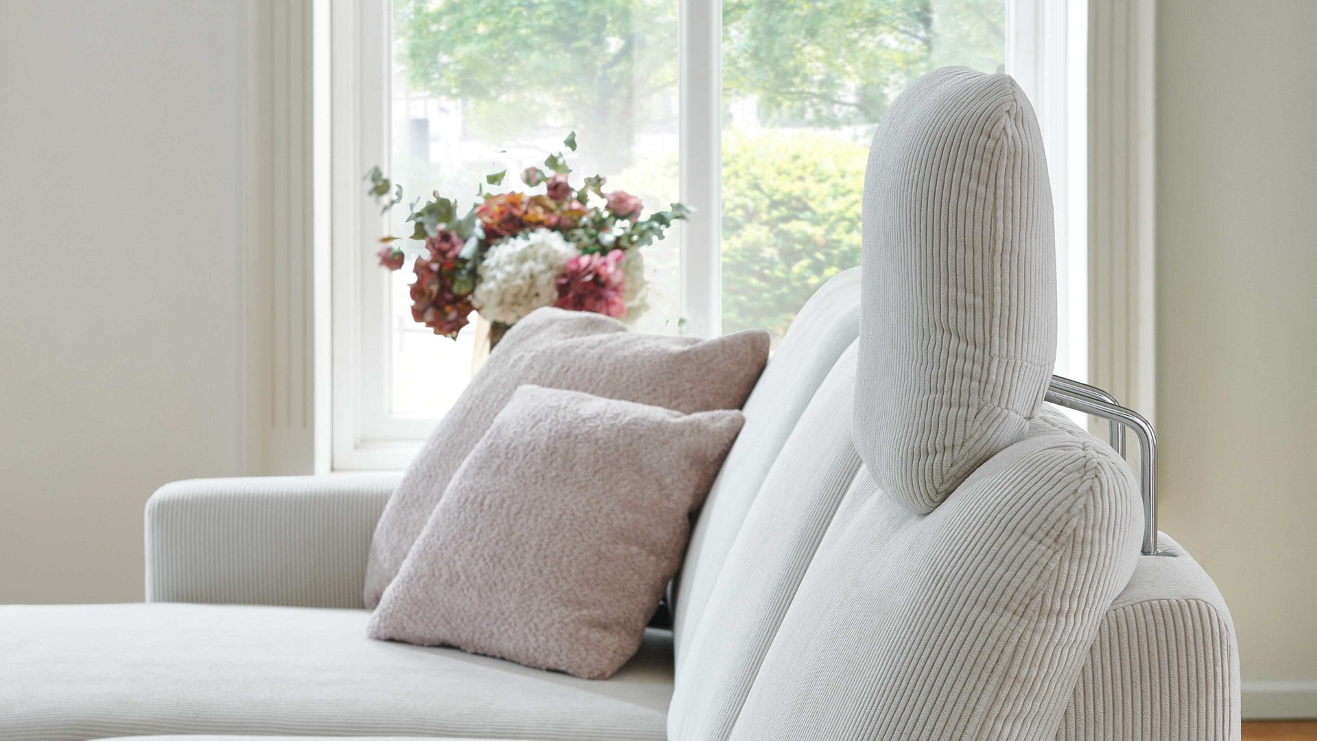 Sie lässt sich manuell in der Höhe und Neigung verstellen. Die mitgelieferte Kopfstützen-Vorrichtung aus robustem verchromten Metall ermöglicht die stufenlose Fixierung der Kopfstütze, deren Maße sich auf ca. 44 x 32 x 16 cm (BxHxT) belaufen. Mit dem naturweißen Feincordbezug harmoniert das Kopfpolster perfekt mit den Couches im gleichen Design.
