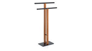Handtuchhalter aus schwarzem Metall und eingefärbtem Bambus. Die Kombination aus dem modernen, matten Finish des Metalls und der natürlichen Schönheit des Bambus sorgt für einen stilvollen Akzent, der perfekt in jedes Badezimmer passt. Mit einer Höhe von 93 cm bietet der Handtuchhalter ausreichend Platz, um deine Handtücher ordentlich und immer griffbereit aufzubewahren. Die zwei Handtuchstangen ermöglichen es dir, deine Handtücher auf praktische Weise zu organisieren – für mehr Komfort und Struktur in deinem Bad. Das minimalistische Design sorgt für eine harmonische Integration in jedes Raumkonzept. Der Handtuchhalter ist nicht nur funktional, sondern auch ein echter Blickfang, der die natürliche Schönheit von Bambus mit der modernen Schlichtheit von Metall vereint. Maße ca. 50 x 93 x 20 cm (BxHxT)