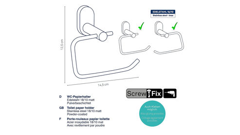 Unser schwarzer WC-Papierhalter Alessio aus hochwertigem Edelstahl vereint Eleganz und Modernität für dein Badezimmer. Die matte Pulverbeschichtung sorgt für eine ansprechende Optik und Langlebigkeit. Mit seiner schlanken Konstruktion und einfachen Montage fügt sich dieser Halter nahtlos in jedes Ambiente ein. Gönnen Sie sich Komfort und Stil mit diesem zeitlosen Accessoire! Maße ca. 15 x 8 x 13 cm (BxHxT).