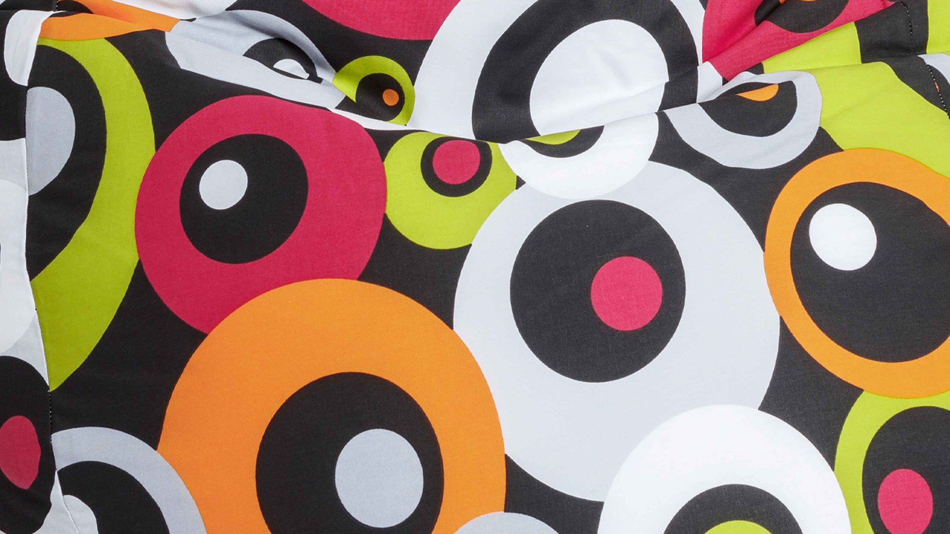 Mit seinen bunten Kreisen und Kringeln ist der Bean Bag L der Marke SITTING POINT nicht zu übersehen. Das moderne Sitzmöbel mit den orangefarbenen, pinken, weißen, grauen und grünen Elementen auf schwarzem Grund ist mit hochwertigen Polystrol-Kügelchen gefüllt und mit einem Überzug aus Baumwolle ausgestattet.
