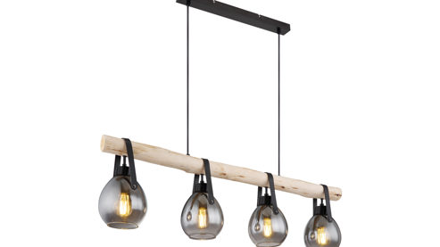Die Hängeleuchte aus der Interliving Leuchten Serie 9332 begeistert mit einer raffinierten Kombination aus klassisch mattschwarzem Metall, naturfarbenem Holz und vier Lampenschirmen, die verspiegeltes, rauchfarbenes Glas mit feinem schwarzem Kunstleder verbinden. Das Ergebnis ist ein außergewöhnlicher Look, der moderne Eleganz, futuristische Akzente und den Charme des Industrial-Stils harmonisch vereint.