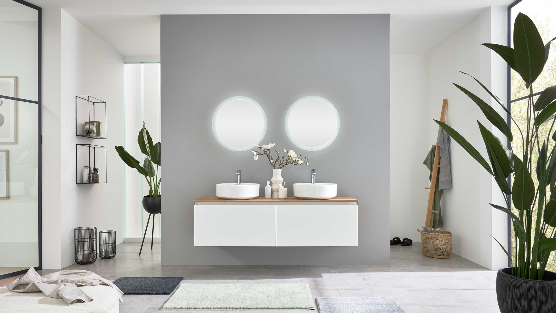 • Die Abbildung zeigt ein Wohnbeispiel, welches auch Dekoration sowie separat erhältliches Zubehör enthält. Im Lieferumfang enthalten sind ein Spiegel, ein Waschbecken und ein Unterschrank.