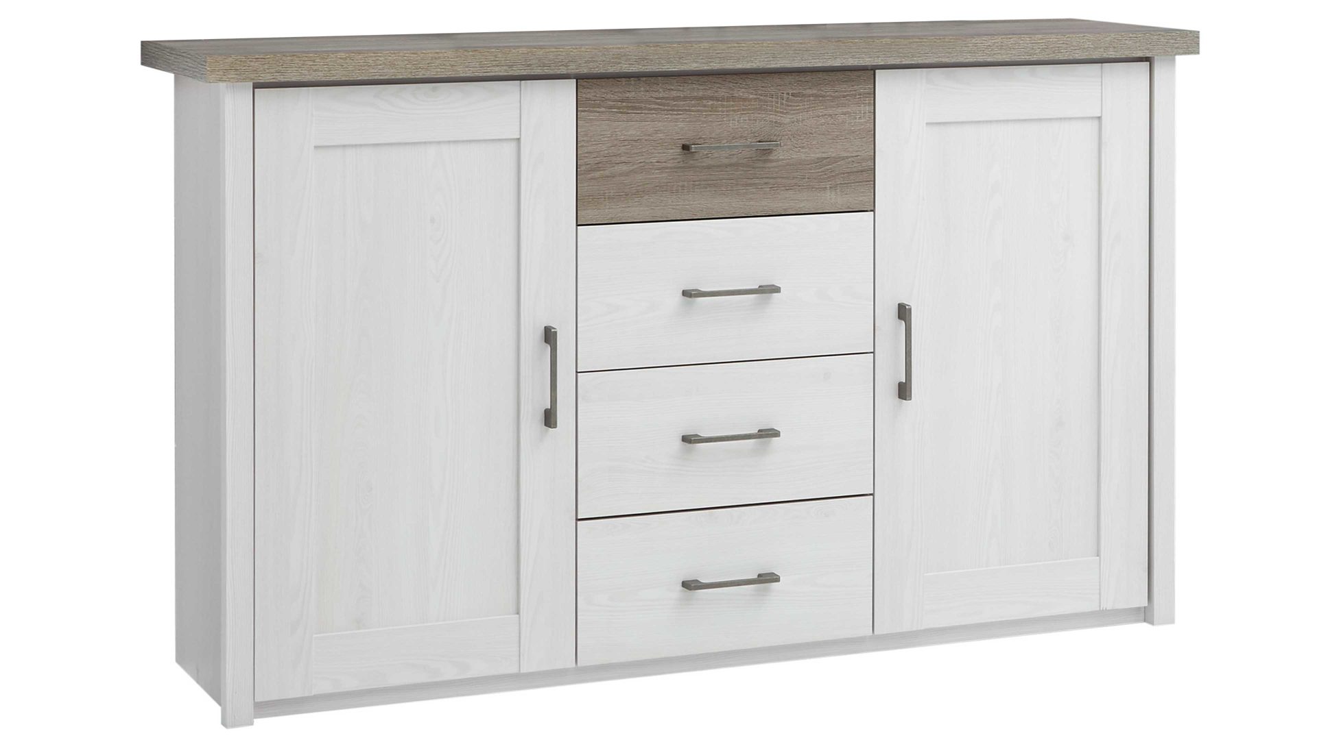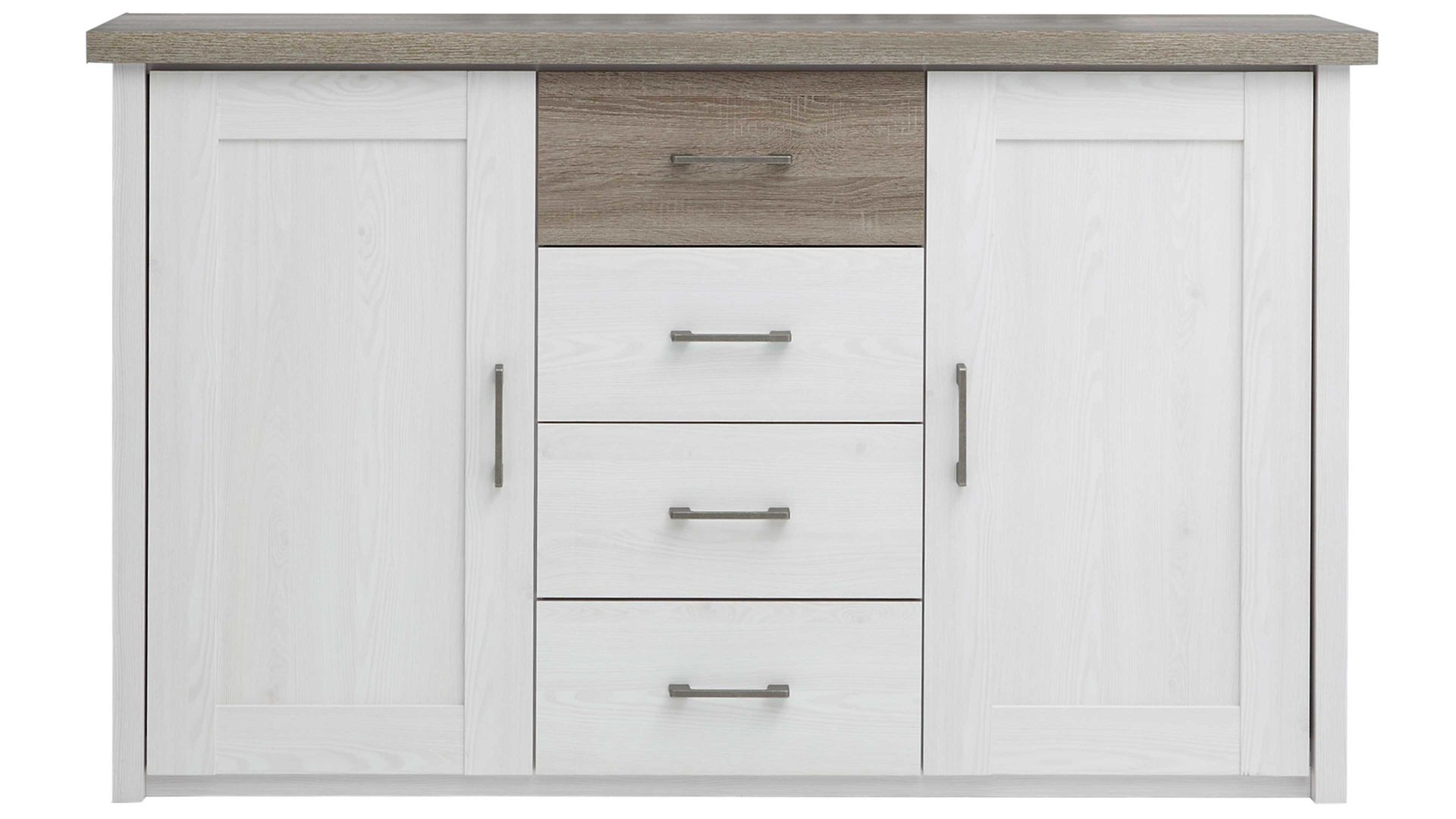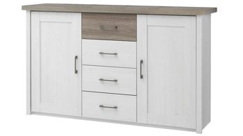 Hinter den zwei Türen befinden sich jeweils zwei Holzböden. Hinzu kommen vier Schubladen in der Mitte. Somit haben Sie jede Menge licht- und staubgeschützten Stauraum für Unterwäsche, Handtücher und sonstige Textilien sowie kleine Accessoires. Auch der Oberboden eignet sich als Ablage - etwa für dekorative Elemente wie Vasen, Skulpturen und Bilderrahmen mit persönlichen Fotos. Die Maße des in allen Belangen absolut überzeugenden Kommodenschranks belaufen sich auf ca. 150 x 90 x 42 cm (BxHxT).