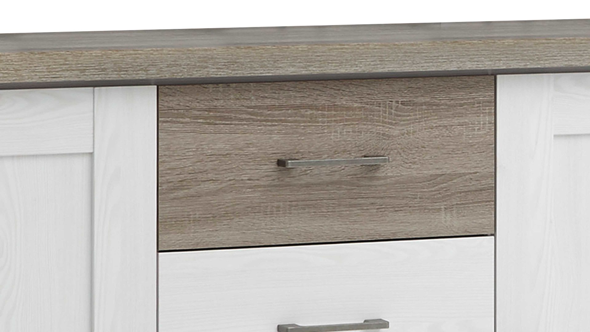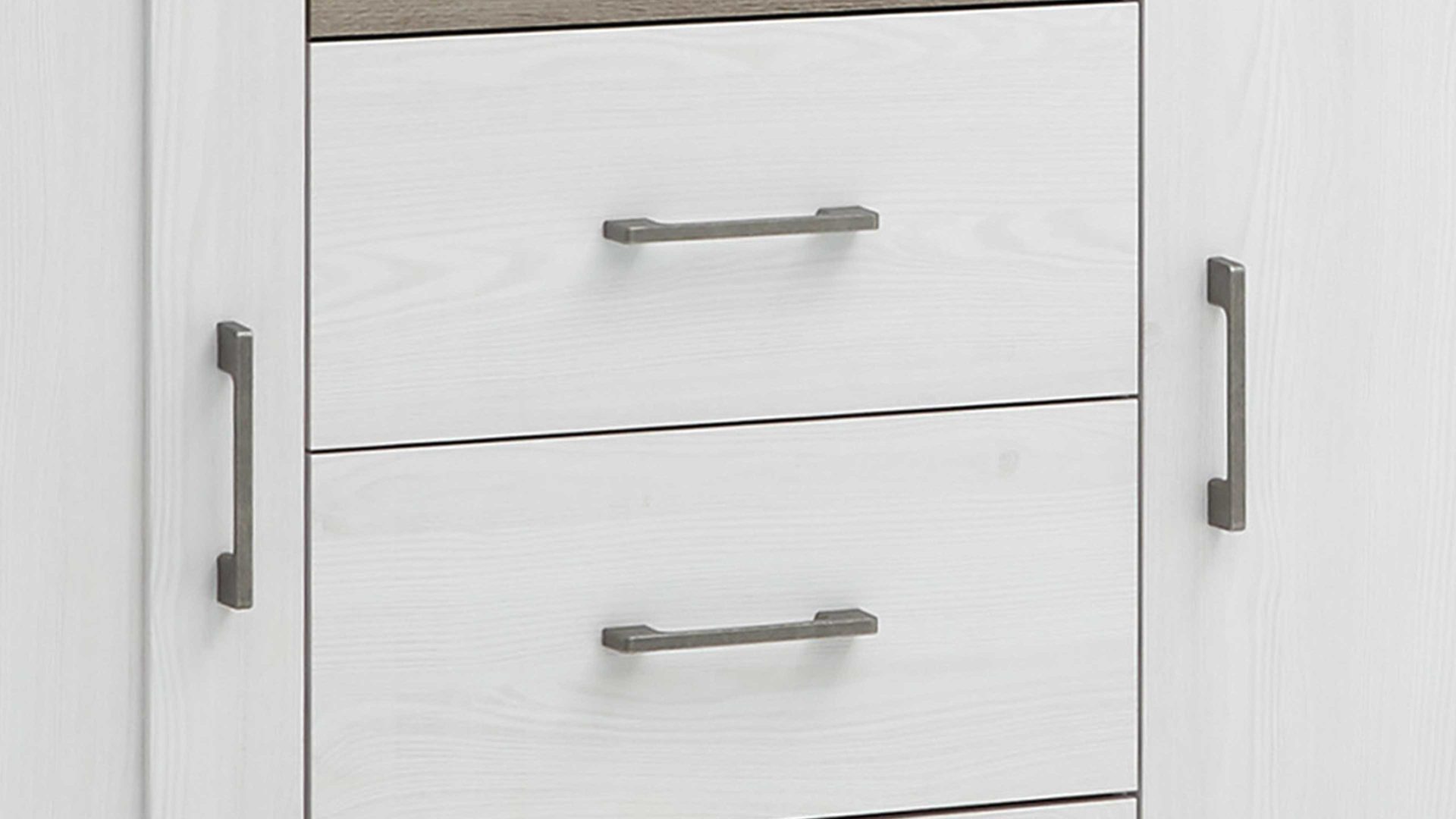 Diese ansprechende Kombikommode wertet Ihr Schlafzimmer optisch wie funktional auf. Sie begeistert mit ihrem klassisch-eleganten Design, das Landhaus-Flair gepaart mit antikem Charme mit sich bringt. Zu weiten Teilen präsentiert sich der Schrank in weißer Pinien-Nachbildung. Akzentuierend wirken die trüffelfarbenen Details und die dunklen Griffe. Sie verleihen der prinzipiell hell gestalteten Kommode eine attraktive Tiefgründigkeit. Neben den visuellen Vorzügen bieten die erstklassig verarbeiteten Kunststoffoberflächen auch einen funktionalen Vorteil: Sie sind angenehm pflegeleicht.