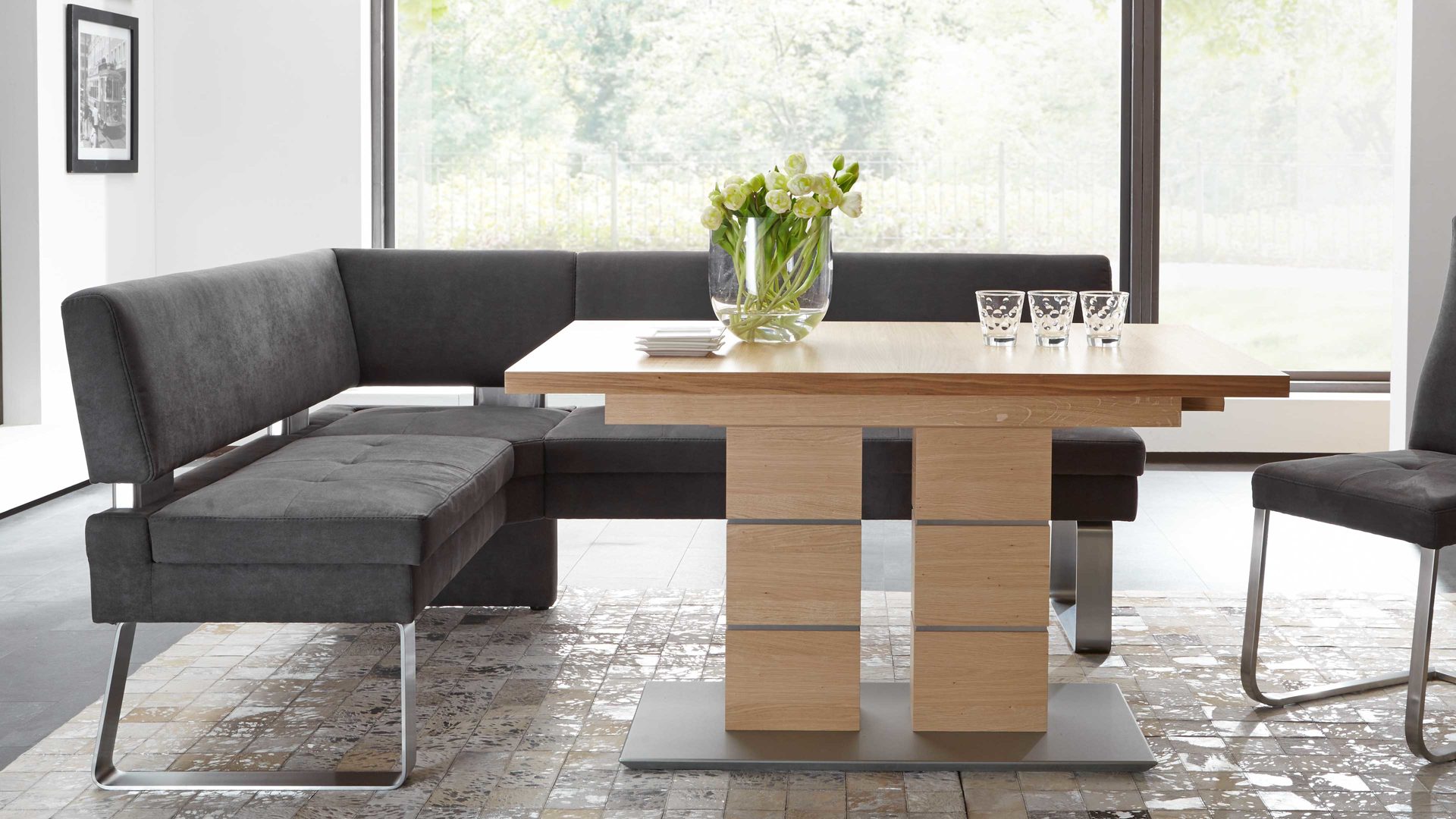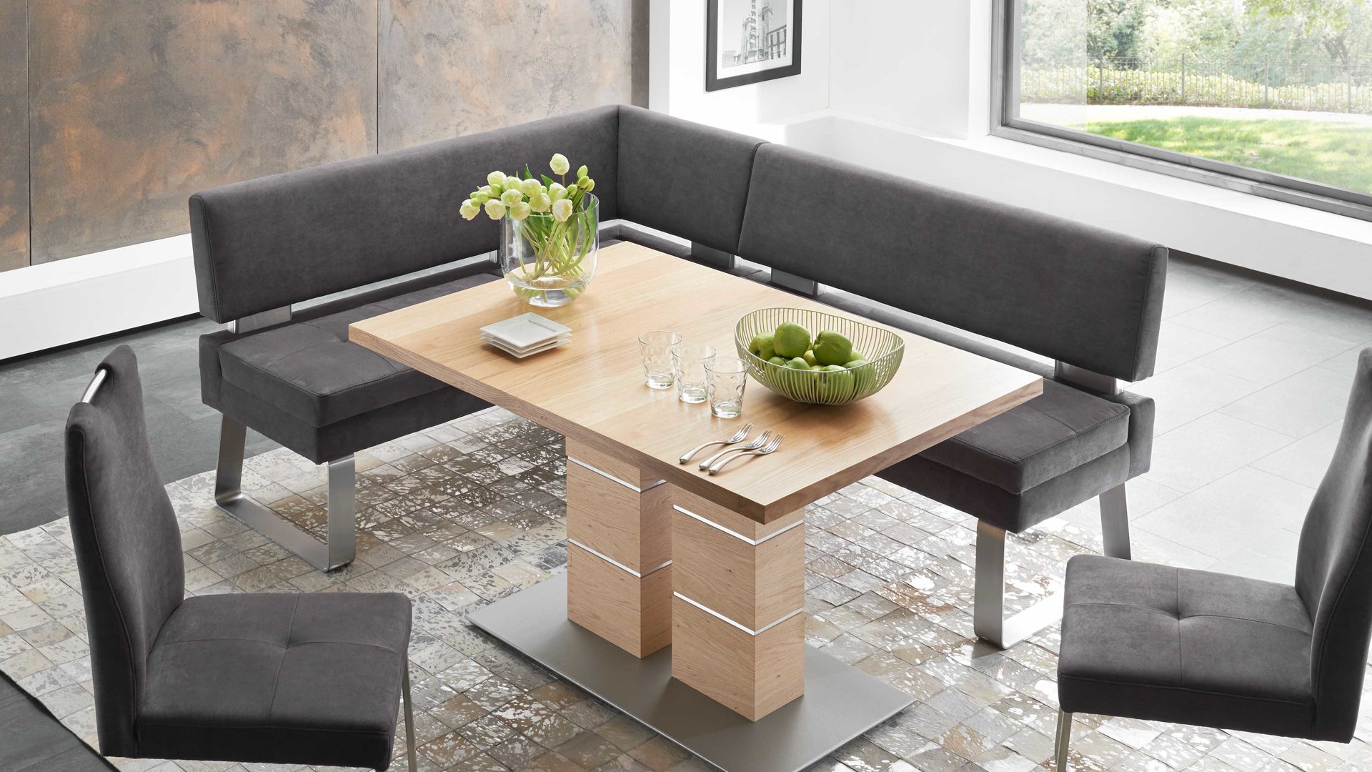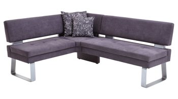 Auch optisch macht die Polster-Eckbank einiges her. Als stabilisierende Basis fungiert ein klassisch-edelstahlfarbenes Metallkufengestell. Es harmoniert vorzüglich mit dem soften Mikrofaserbezug im modernen Farbton Anthrazit. Perfekt abgerundet wird die Eckbank Genesis durch die Distanzhalter, die wiederum im Edelstahlton gehalten sind.