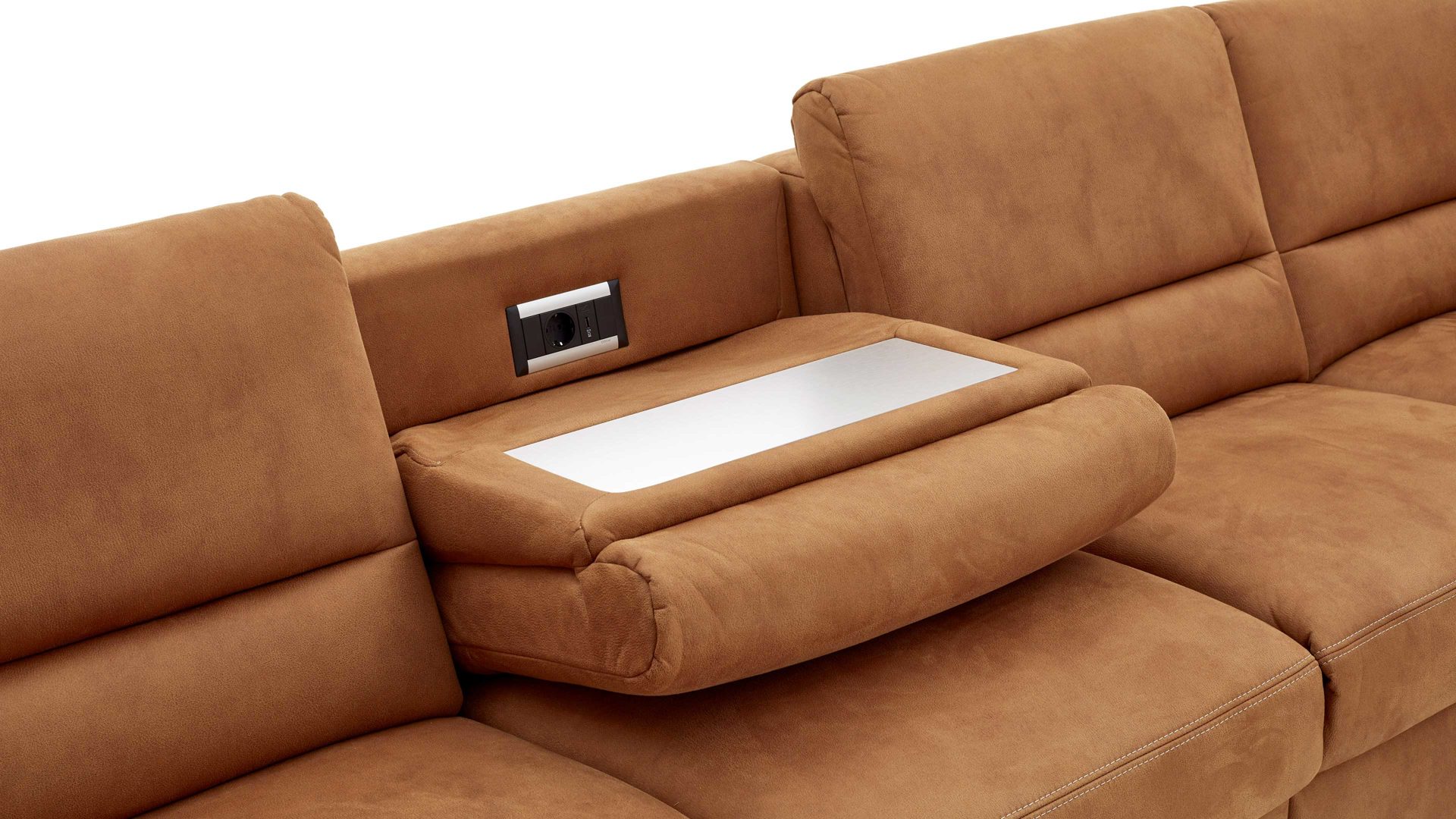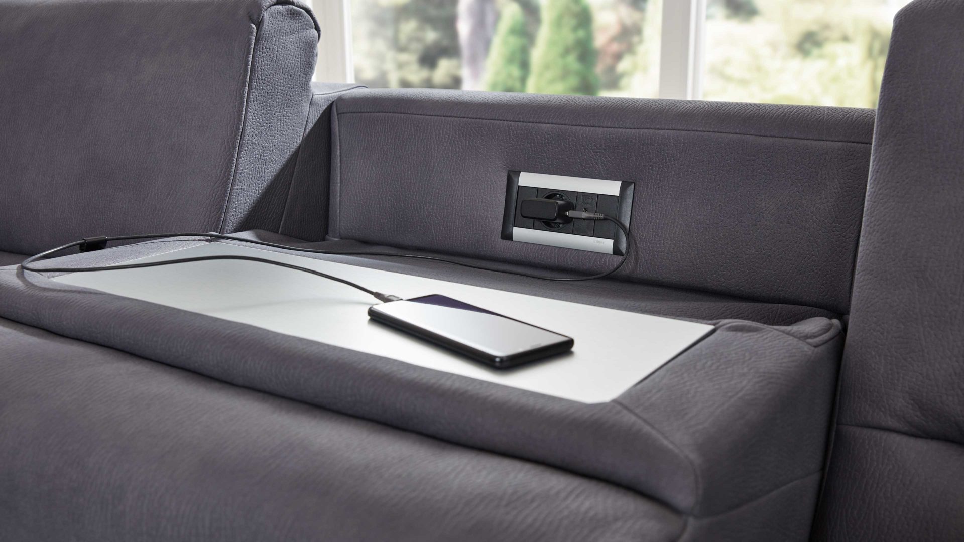 Auf der Rückseite des jeweiligen Rückenpolsters ist eine aluminiumfarbene Ablageplatte in den Bezug eingearbeitet - sie greift den Ton der Couchfüße noch einmal auf und sorgt dadurch für ein harmonisches Gesamtbild. Indem Sie das Rückenpolster nach vorne klappen, schaffen Sie eine praktische Ablagefläche samt Steckdose und USB-Anschluss.