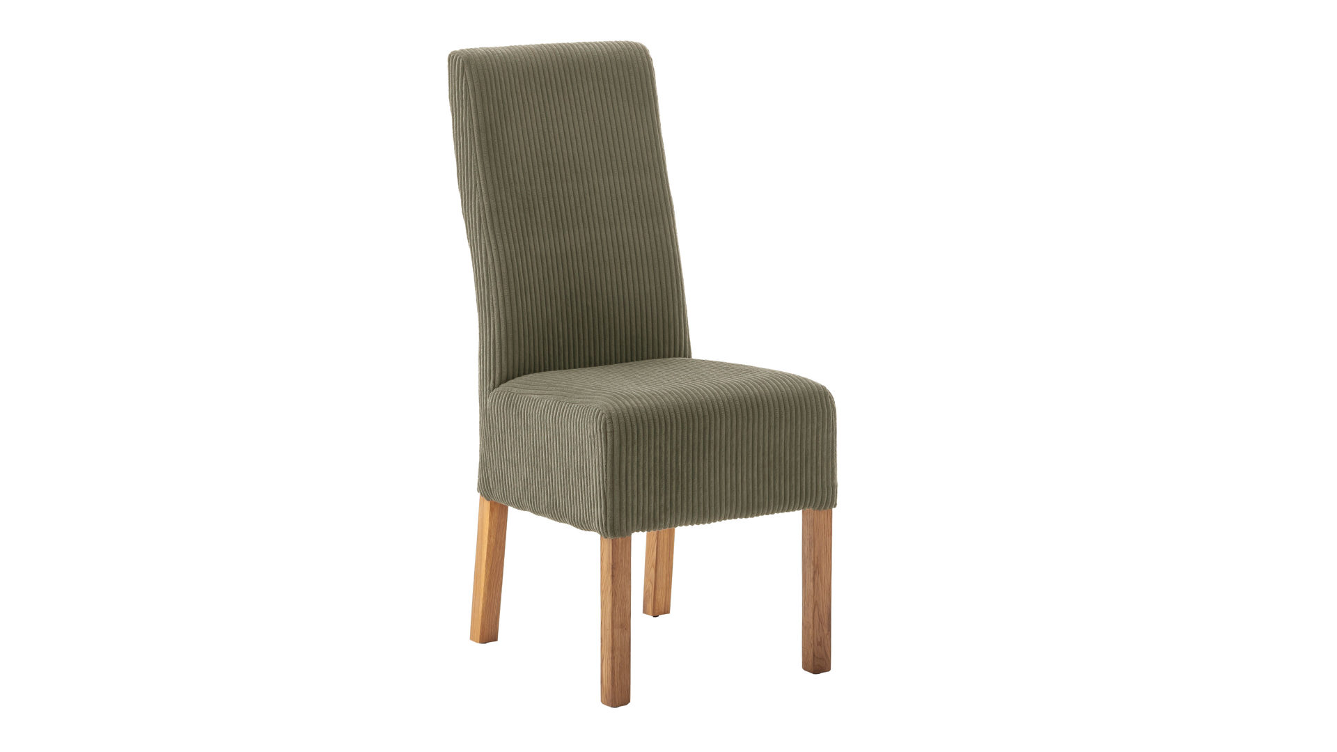 Seine Sitzschale inklusive der gepolsterten Armlehnen ist komplett in einer edlen Vintage-Veloursoptik gehalten. Entlang aller Kanten ist der Stuhl mit Keder verstärkt. Der Velours in einem warmem Olivton trifft auf vier mattschwarz lackierte Metallfüße. Einen spannenden Kontrast bildet die softe Oberfläche zu der geradlinigen Formensprache.
