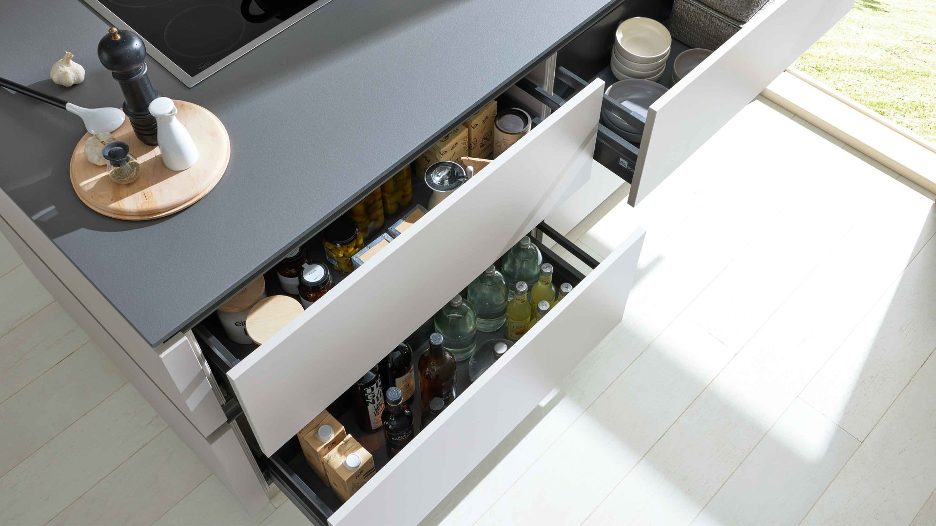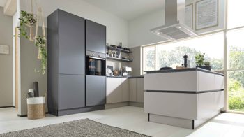 Interliving Küche Serie 3060 – elegante Systemküche in Sahara und Quarzgrau