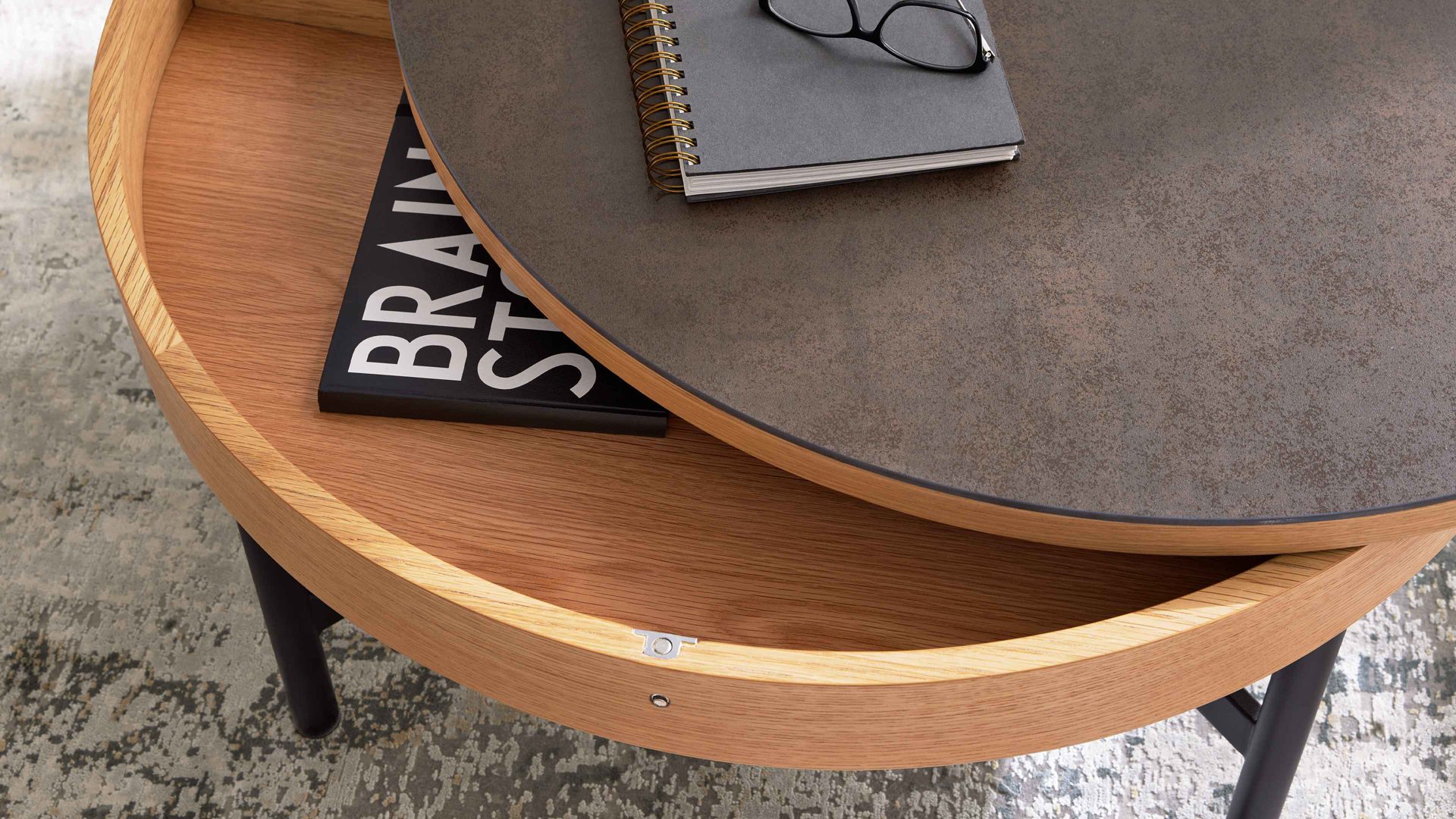 titanfarbene Keramik, Eichefurnier & schwarzer Stahl - Durchmesser ca. 44 cm
