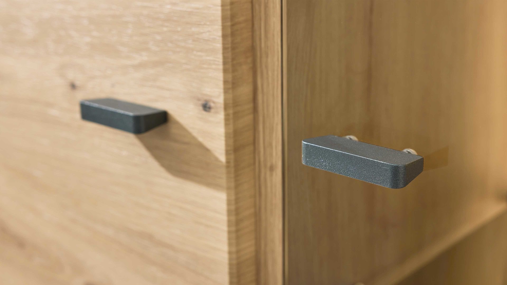 Die Kombination aus attraktiver Alteiche-Nachbildung, grauen Glaselementen und anthrazitfarbenen Metallgriffen schafft ein modernes, gleichzeitig warmes Erscheinungsbild. Dieses Designkonzept betont die natürliche Ausstrahlung der Holzoptik und sorgt für eine angenehme Balance zwischen Wohnlichkeit und zeitgemäßem Stil.