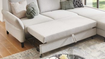 Das zweisitzige Element 02110 des Sofas verfügt über eine klappbare Armlehne auf der linken Seite, die Ihnen zusätzlichen Komfort bietet. Die manuelle Sitztiefenverstellung ermöglicht es Ihnen, die Sitztiefe individuell anzupassen und einen optimalen Sitzkomfort zu erreichen. Die Recamiere 70163 hingegen bietet keine Sitztiefenverstellung, ist aber ideal zum Entspannen geeignet und zudem mit einer Vorbereitung für Steckrücken oder -armteile ausgestattet, sodass Sie sie bei Bedarf erweitern können.