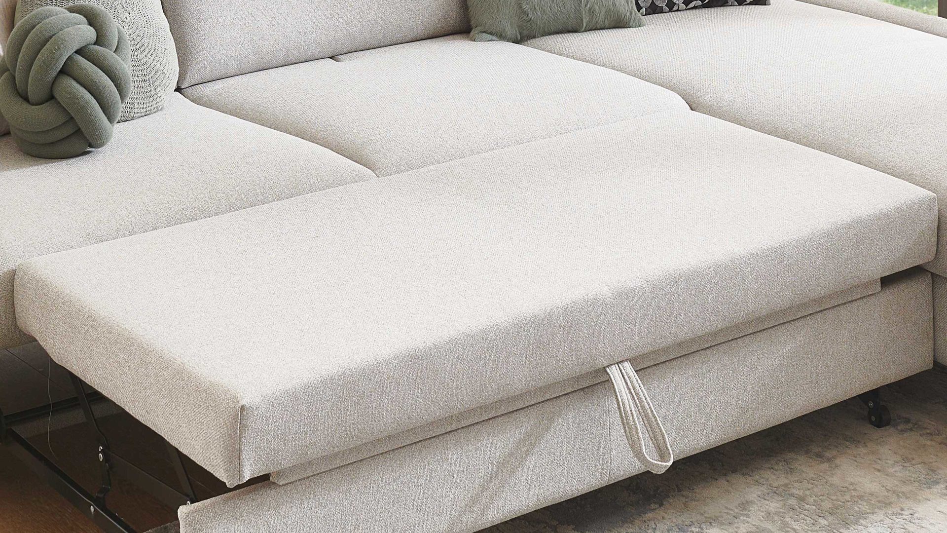 Die stoffbezogene Liegefläche ist ein Mehrpreis für die praktische Bettfunktion der Polstermöbel aus dem Programm Tiamo Plus. Durch dieses Extra präsentiert sich die Liegefläche im gleichen Stoff wie die Sitzfläche des jeweiligen Sofas. Der silberne Stoffbezug präsentiert sich modern-elegant.