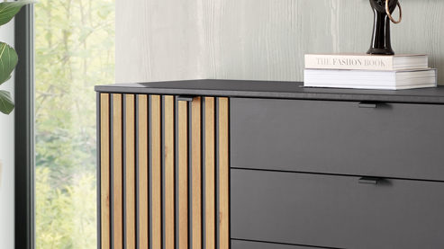 mattes Graphit, kombiniert mit biancofarbener Eiche Nachbildung und mattschwarzen Griffen